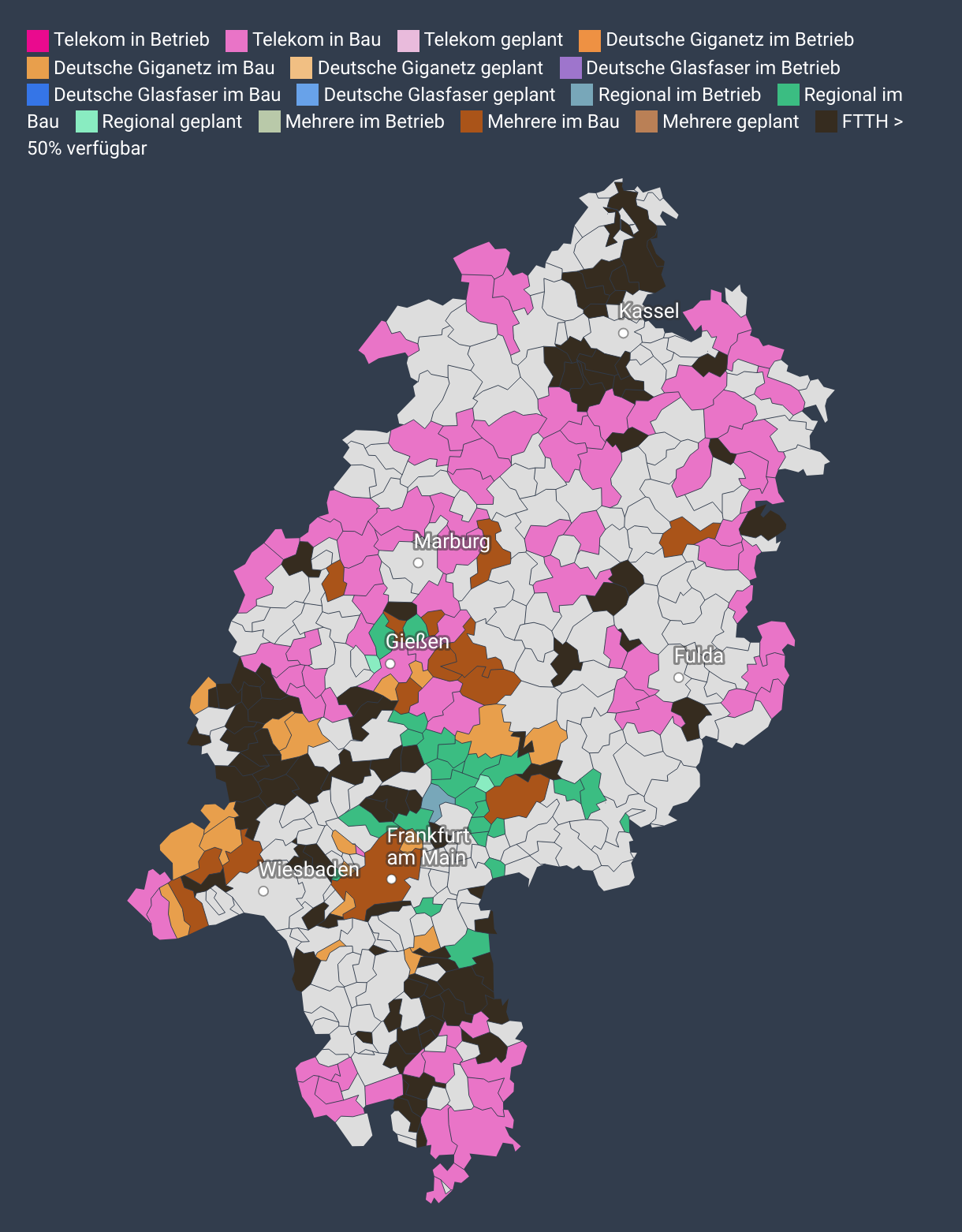This map shows the status of construction and rollout of fibre networks FTTH in the state.