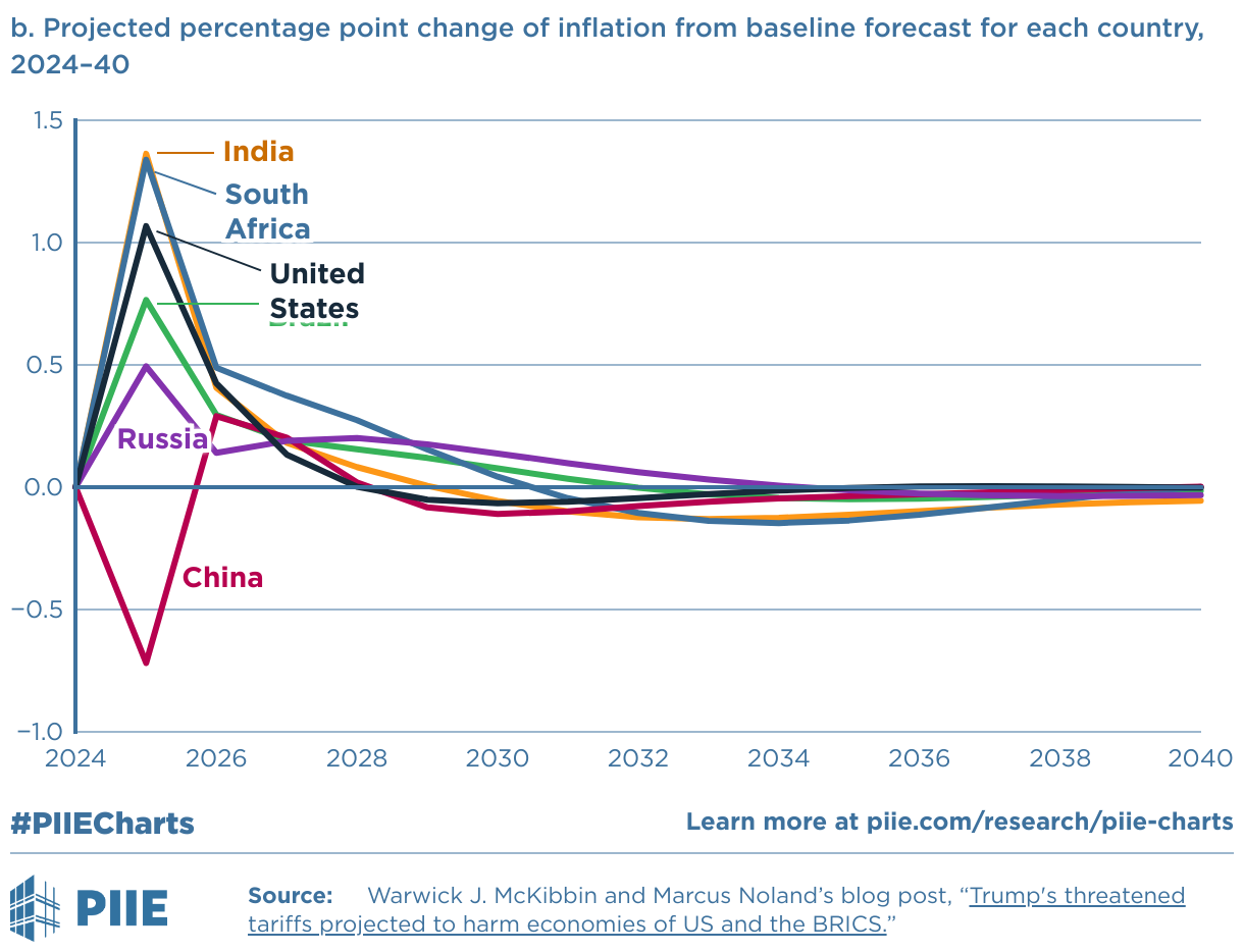 b. Projected percentage point change of inflation from baseline forecast for each country, 2024–40