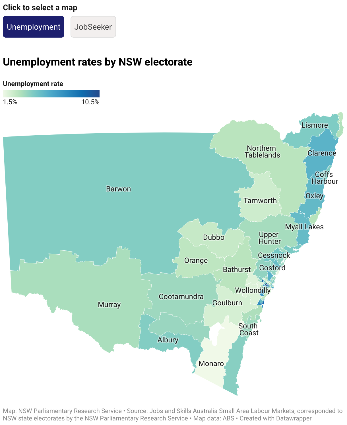 Click to select a map Unemployment JobSeeker Unemployment rates by NSW electorate