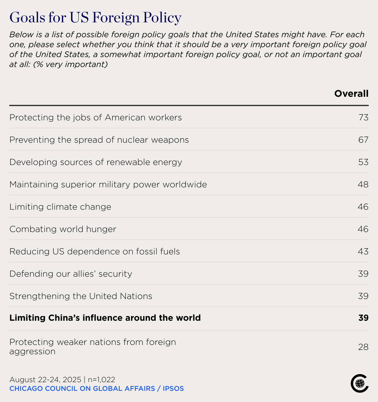 Below is a list of possible foreign policy goals that the United States might have. For each one, please select whether you think that it should be a very important foreign policy goal of the United States, a somewhat important foreign policy goal, or not an important goal at all: (% very important)