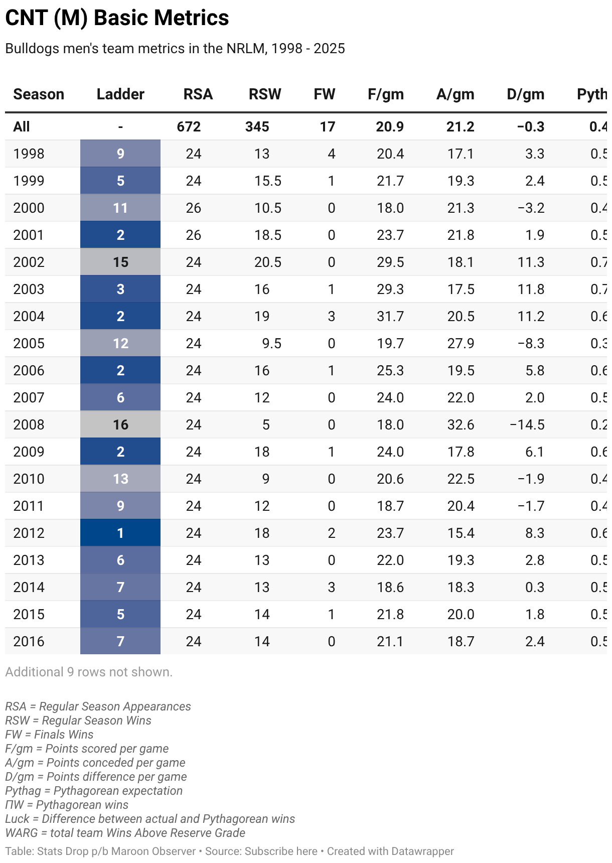 Bulldogs men's team metrics in the NRLM, 1998 - 2025
