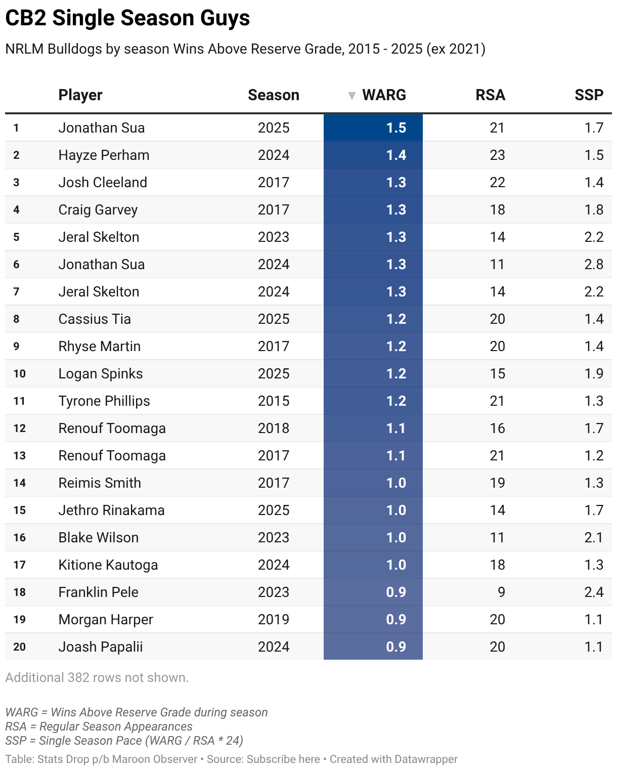 NRLM Bulldogs by season Wins Above Reserve Grade, 2015 - 2025 (ex 2021)