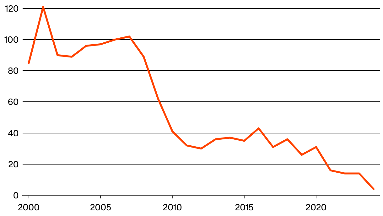 Hover over the line graph to view the number of observed neo-Confederate groups active in the U.S. over time.