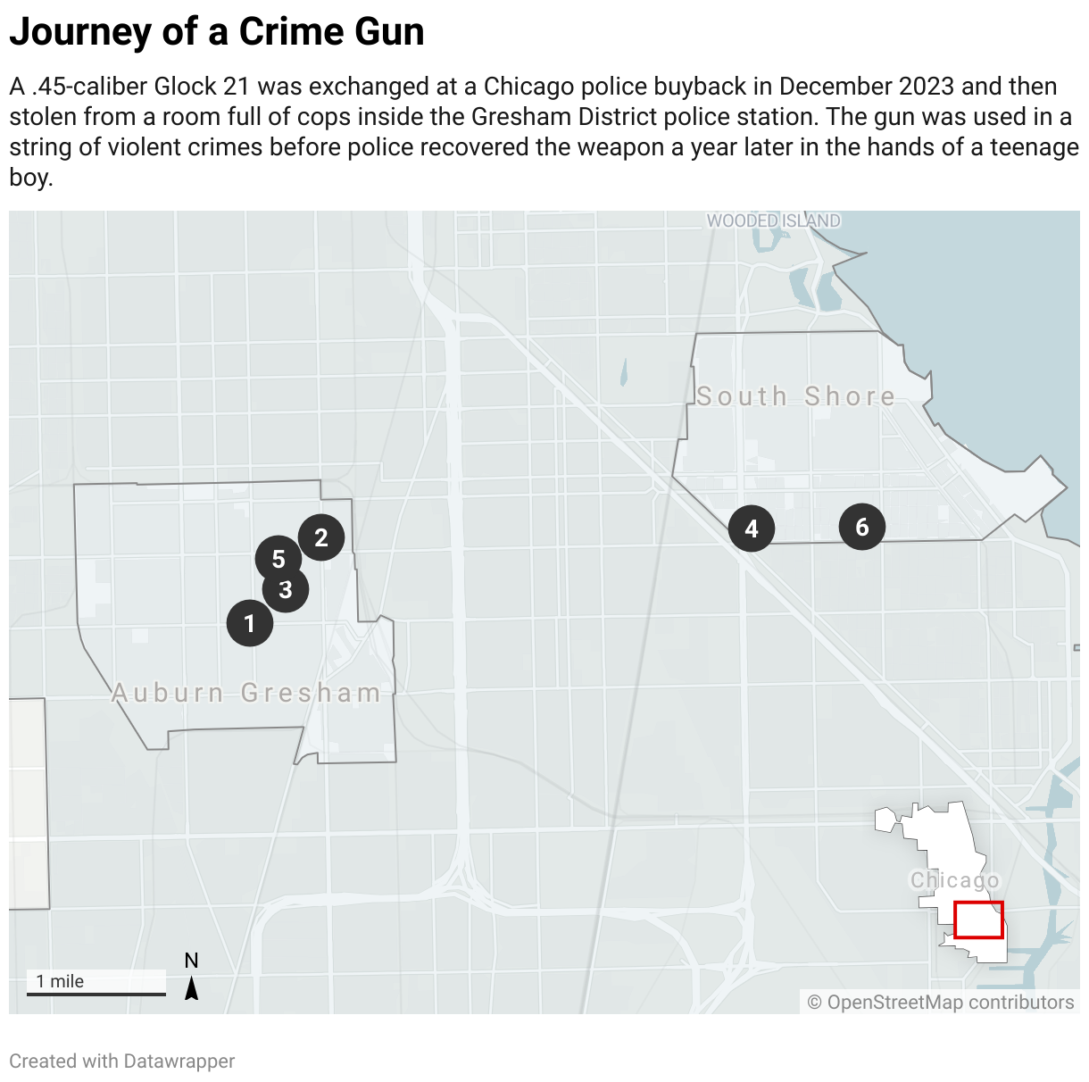 A .45-caliber Glock 21 was exchanged at a Chicago police buyback in December 2023 and then stolen from a room full of cops inside the Gresham District police station. The gun was used in a string of violent crimes before police recovered the weapon a year later in the hands of a teenage boy.