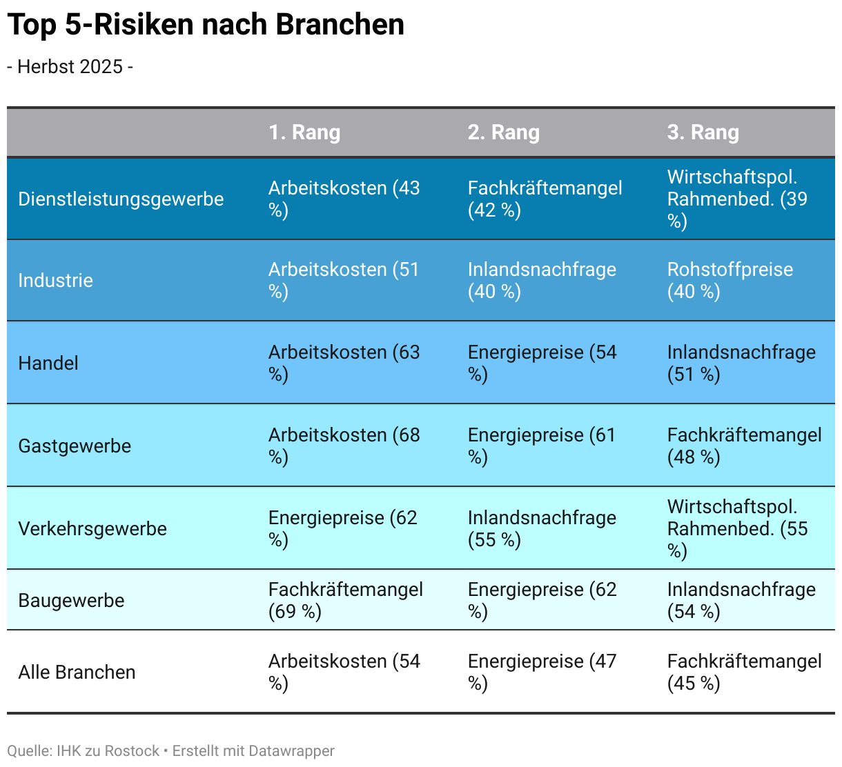 Das Tabellenbild zeigt die fünf größten Risiken für Unternehmen im Herbst 2025 nach Branchen. Arbeitskosten stehen branchenübergreifend an erster Stelle. Energiepreise, Fachkräftemangel, wirtschaftspolitische Rahmenbedingungen und Inlandsnachfrage folgen je nach Branche mit unterschiedlichen Gewichtungen.