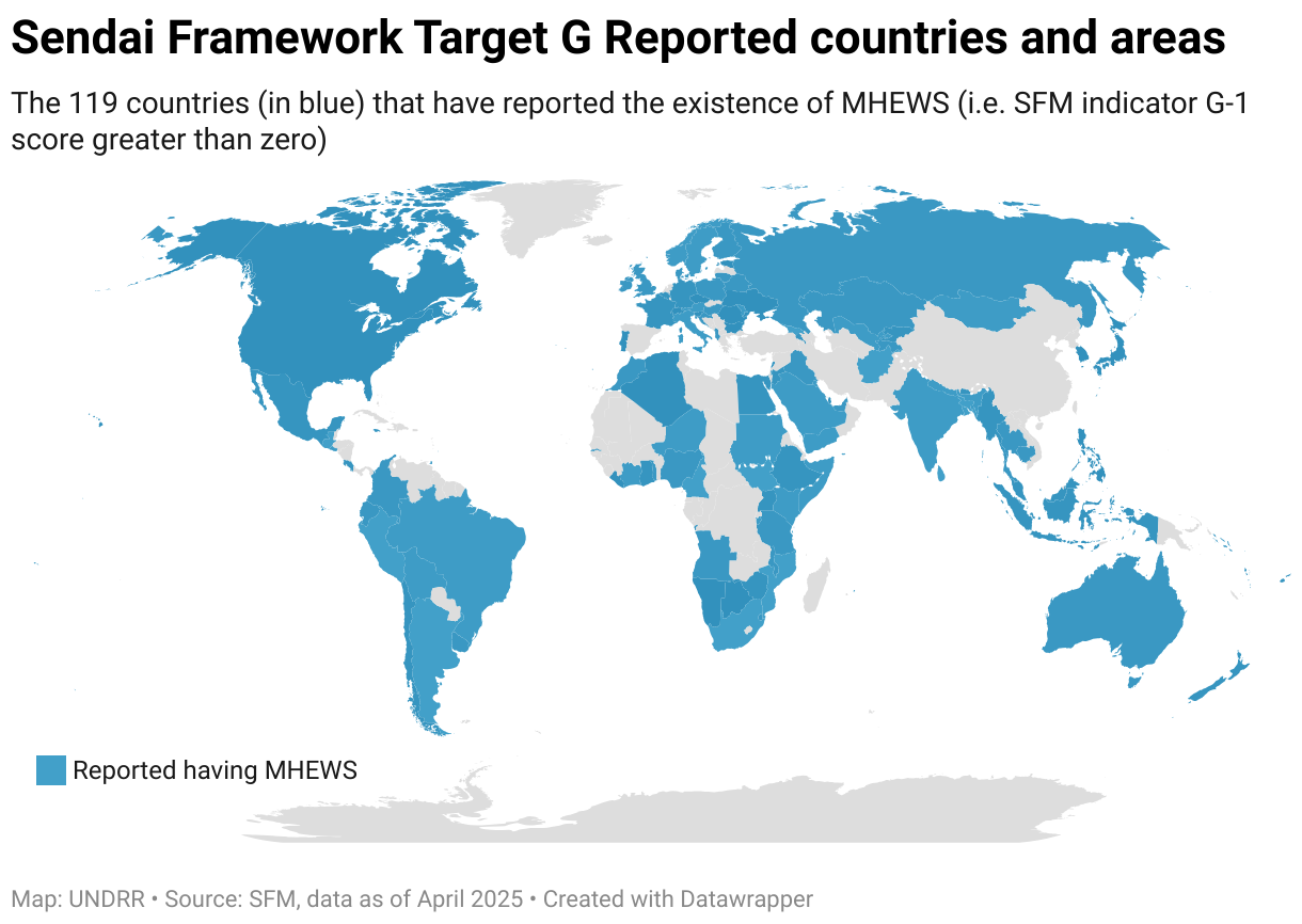 The 119 countries (in blue) that have reported the existence of MHEWS (i.e. SFM indicator G-1 score greater than zero)