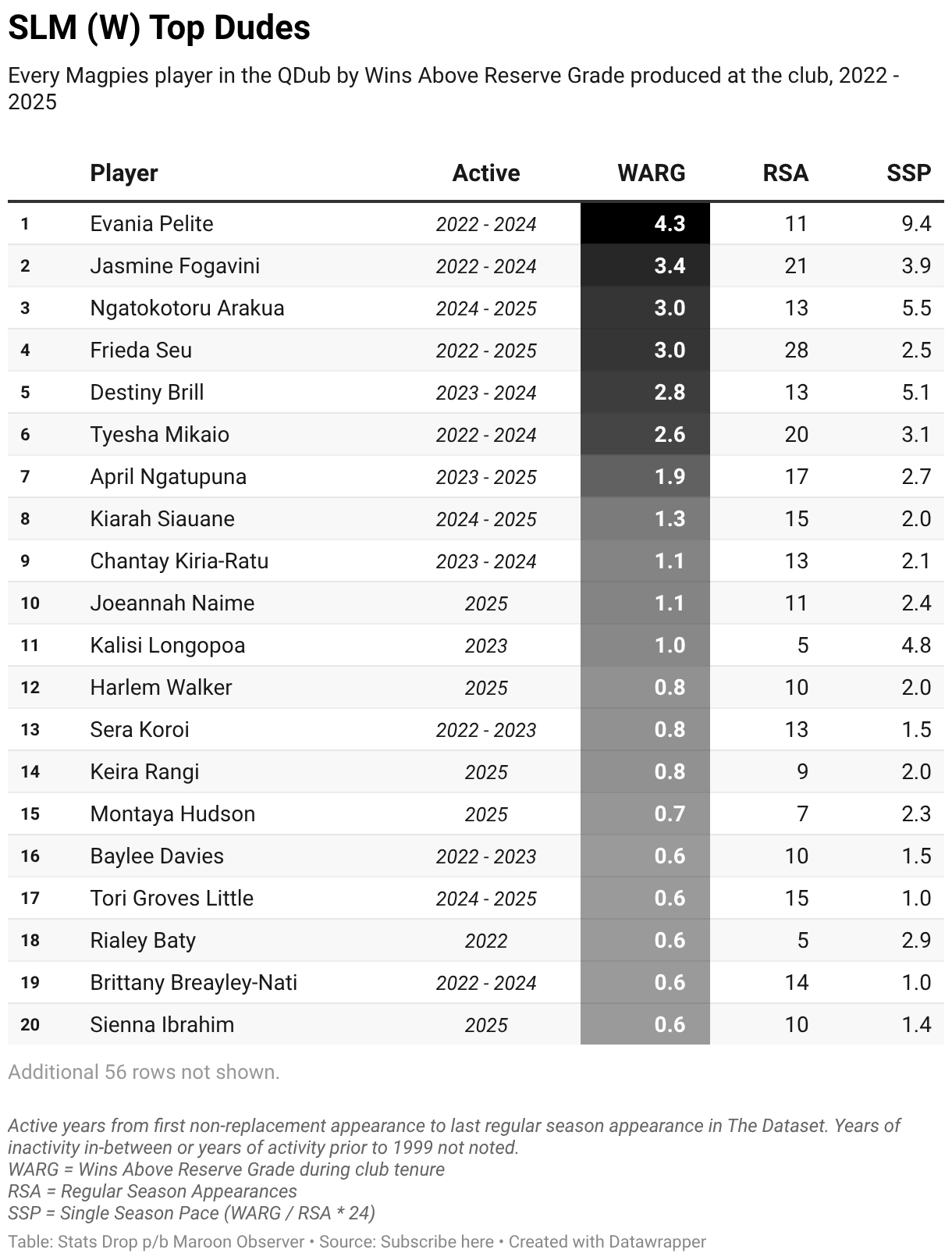 Every Magpies player in the QDub by Wins Above Reserve Grade produced at the club, 2022 - 2025