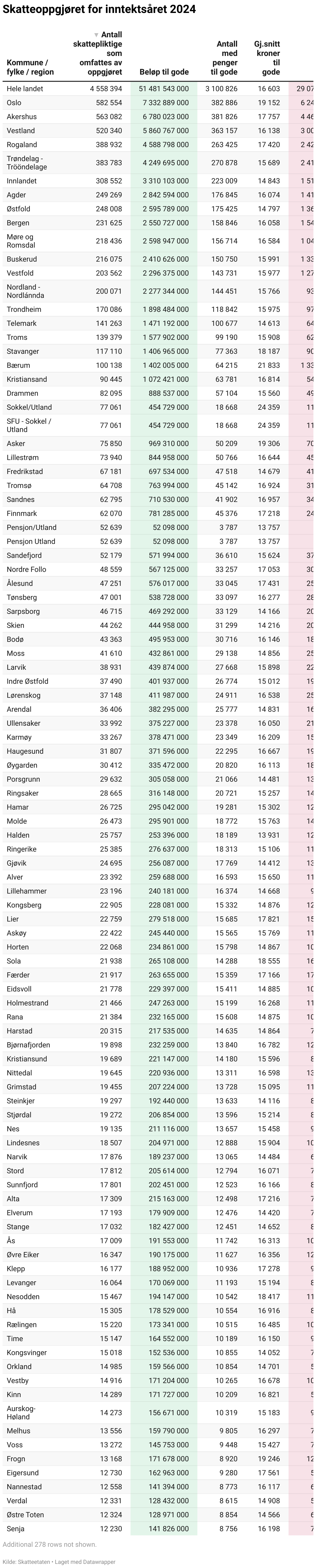 Tabellen viser alle kommuner i Norge med tall på hvor mange skattepliktige som er omfattet av skatteoppgjøret, hvor mye skatt som er betalt, hvor mange som har penger til gode og hvor mye de har hatt til gode, hvor mange som har fått restskatt og hvor mye restskatt de måtte betale.