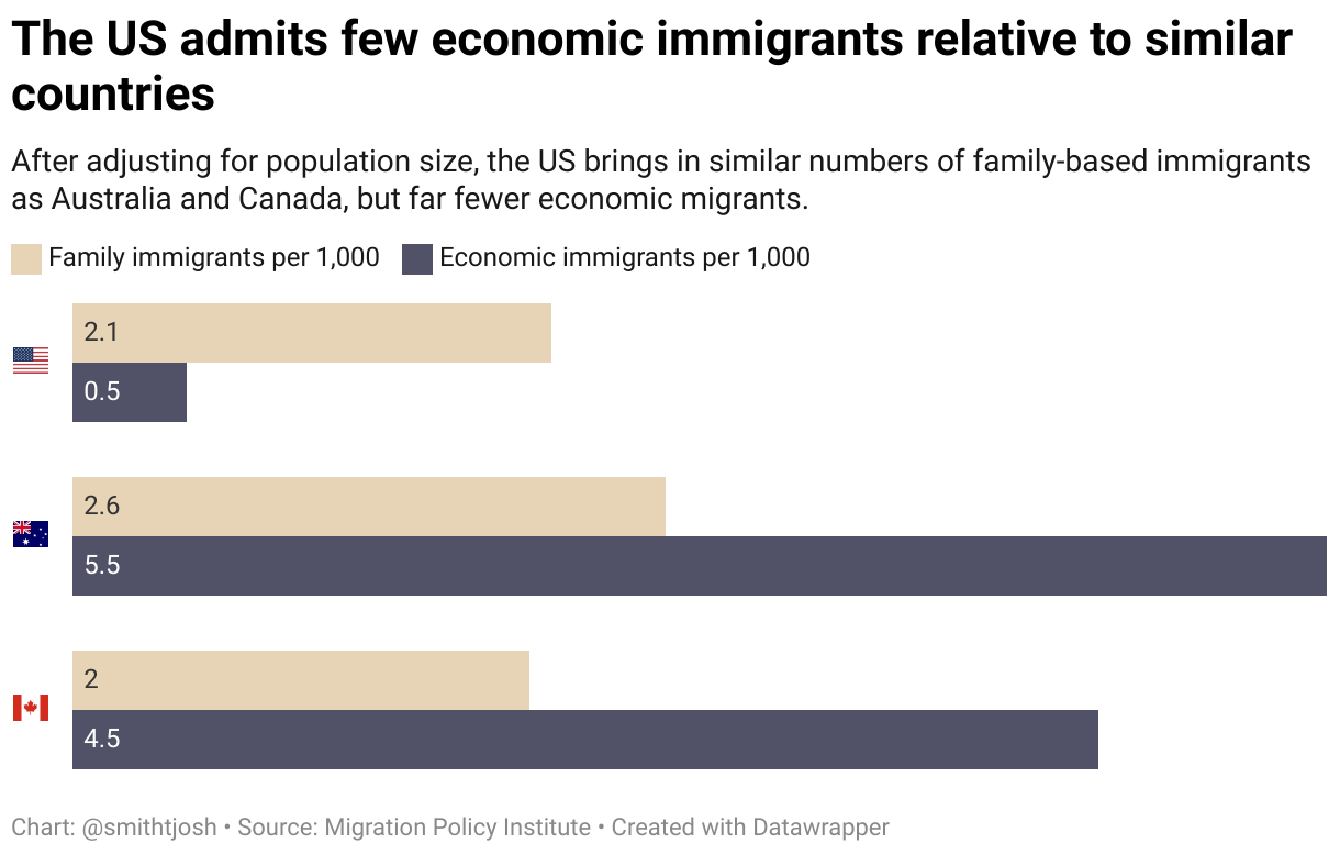 After adjusting for population size, the US brings in similar numbers of family-based immigrants as Australia and Canada, but far fewer economic migrants.