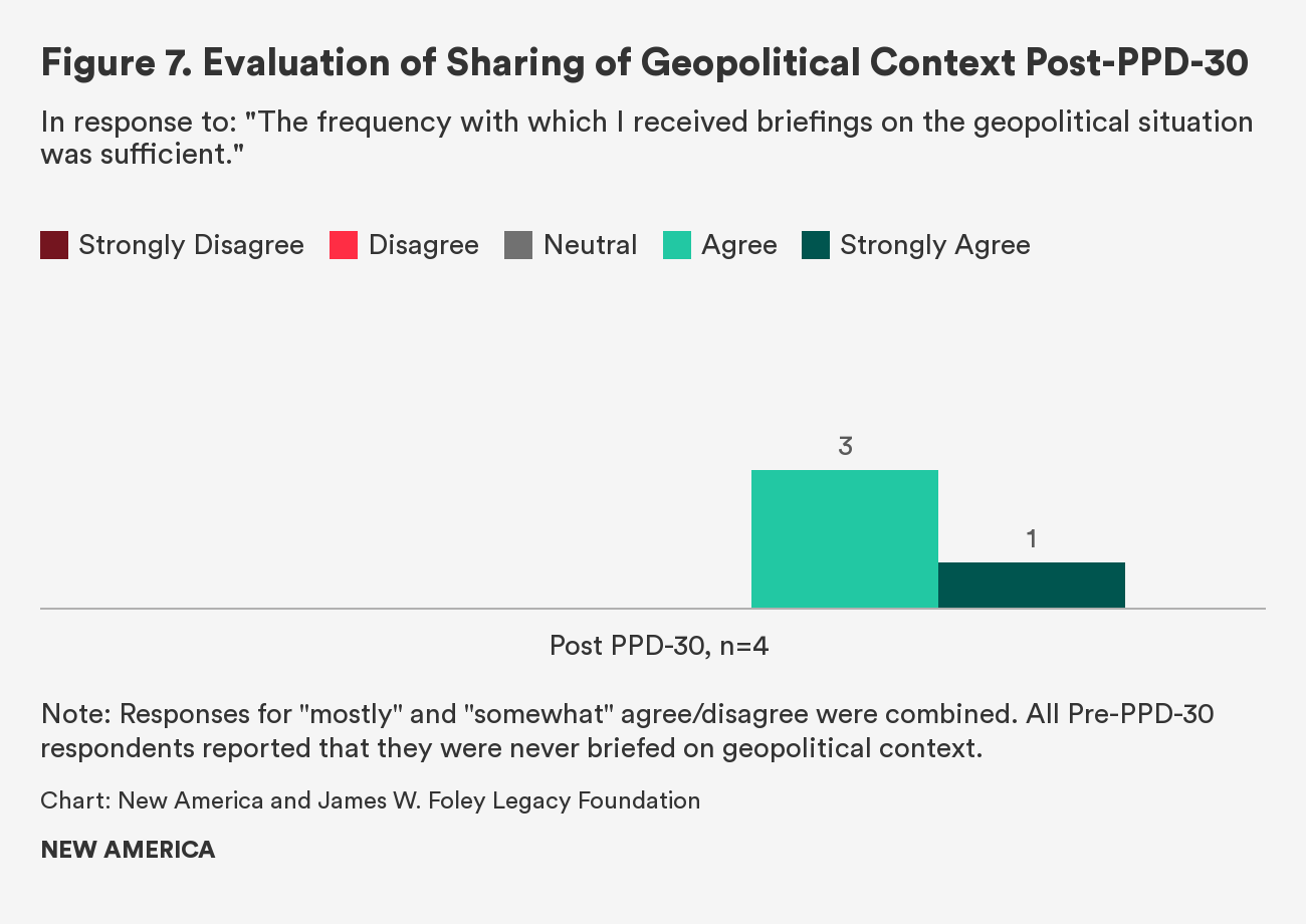 Note: Responses for "mostly" and "somewhat" agree/disagree were combined. All Pre-PPD-30 respondents reported that they were never briefed on geopolitical context.