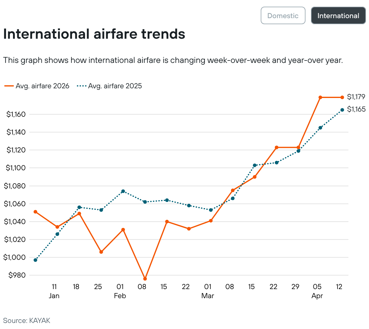 Domestic International International airfare trends This graph shows how international airfare is changing week-over-week and year-over year.