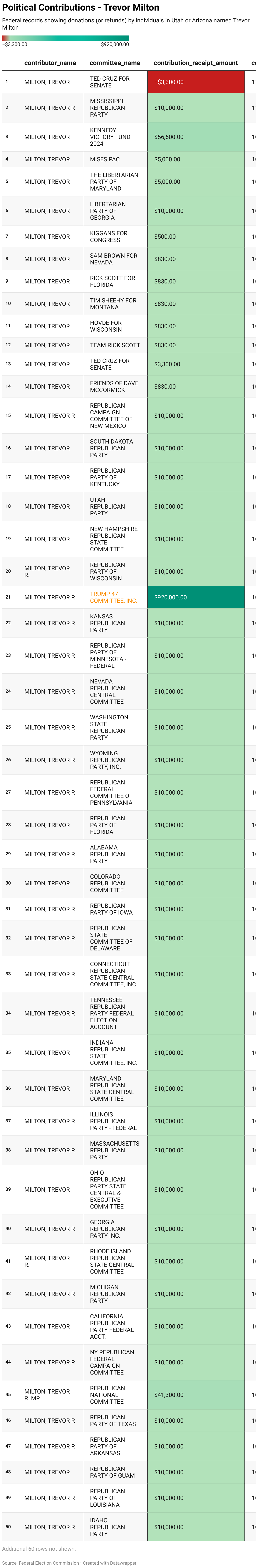 Federal records showing donations (or refunds) by individuals in Utah or Arizona named Trevor Milton