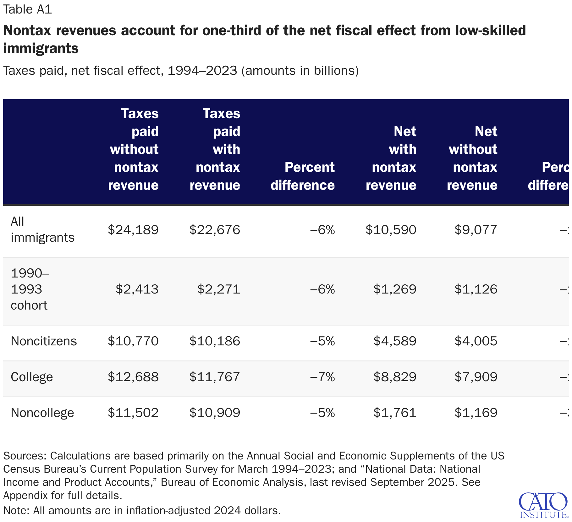 Taxes paid, net fiscal effect, 1994–2023 (amounts in billions)