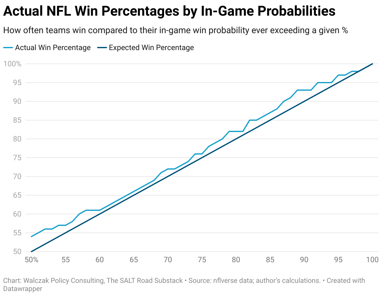 How often teams win compared to their in-game win probability ever exceeding a given %