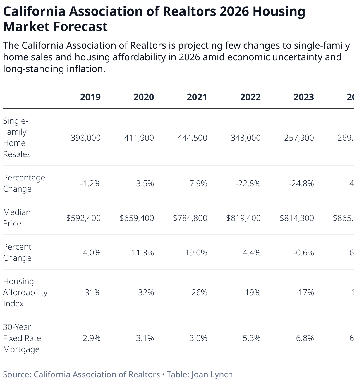 The California Association of Realtors is projecting few changes to single-family home sales and housing affordability in 2026 amid economic uncertainty and long-standing inflation.