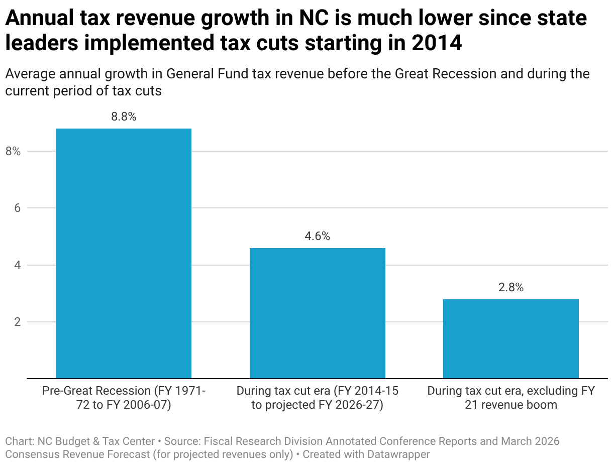 Annual tax revenue growth in NC is much lower since state leaders implemented tax cuts starting in 2014