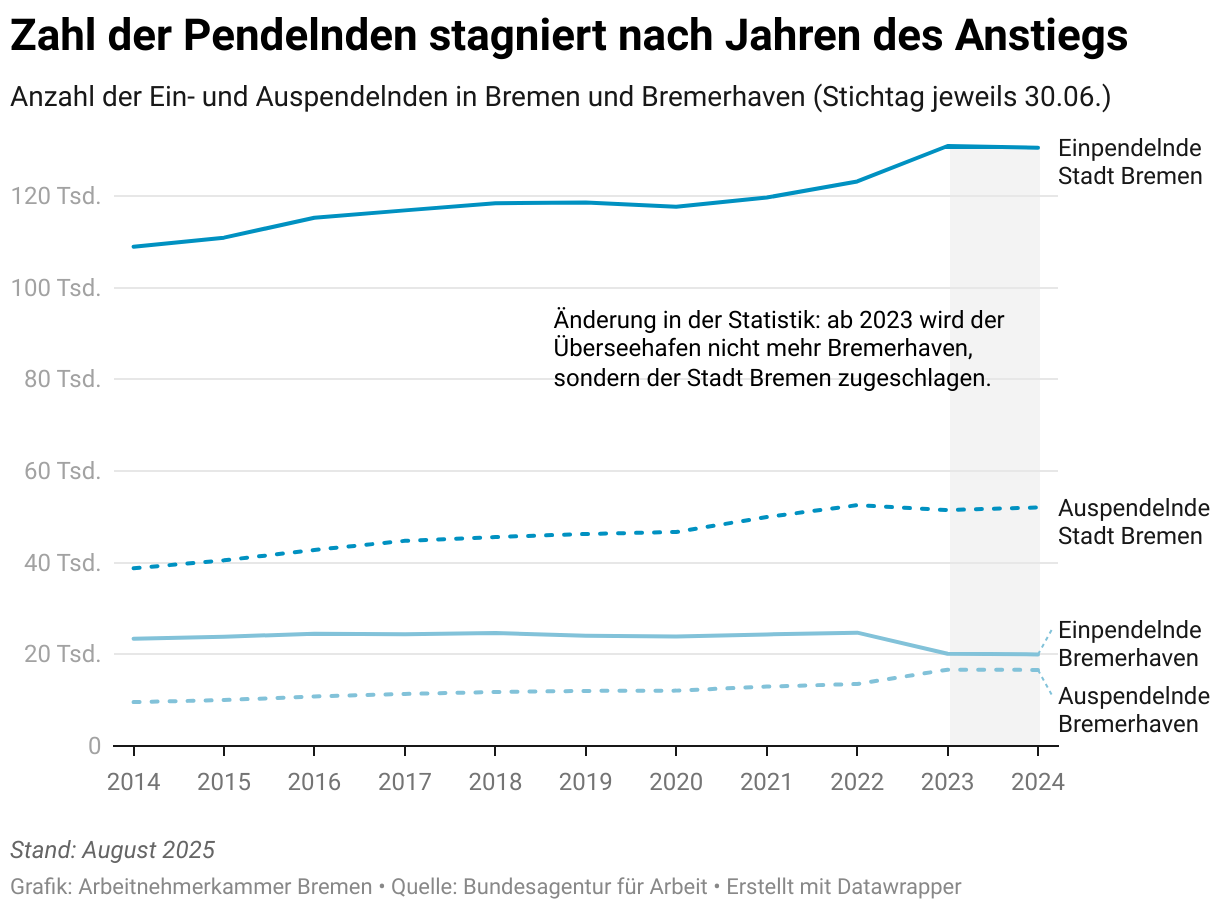 Anzahl der Ein- und Auspendelnden in Bremen und Bremerhaven (Stichtag jeweils 30.06.)