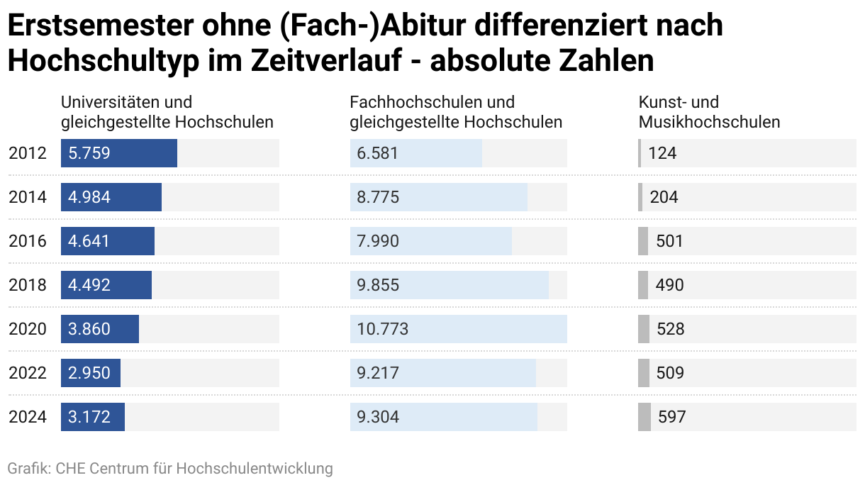 Erstsemester ohne (Fach-)Abitur differenziert nach Hochschultyp im Zeitverlauf - absolute Zahlen
