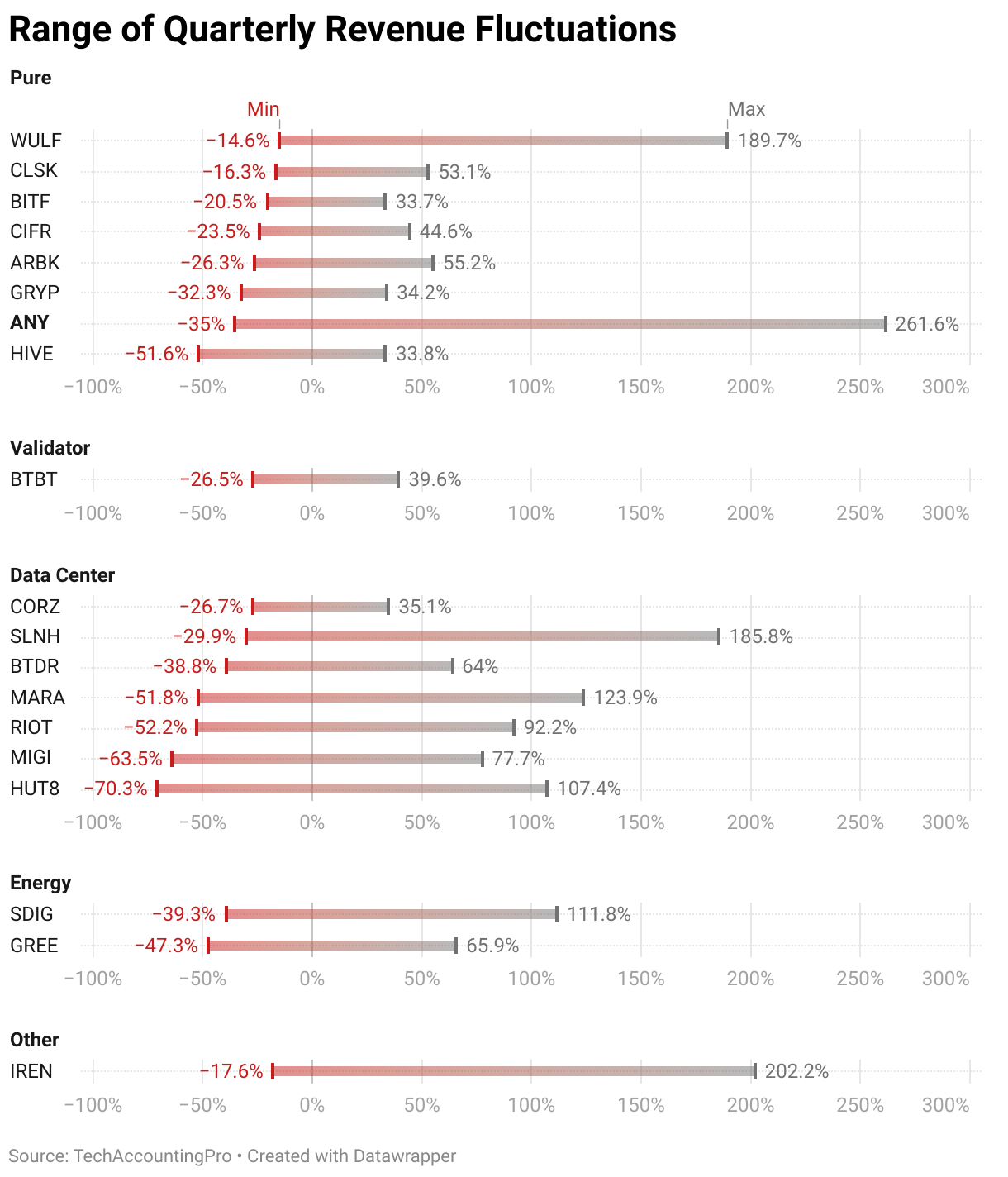 Minimum and maximum quarter over quarter change in cryptocurrency mining revenue observed among sampled companies.