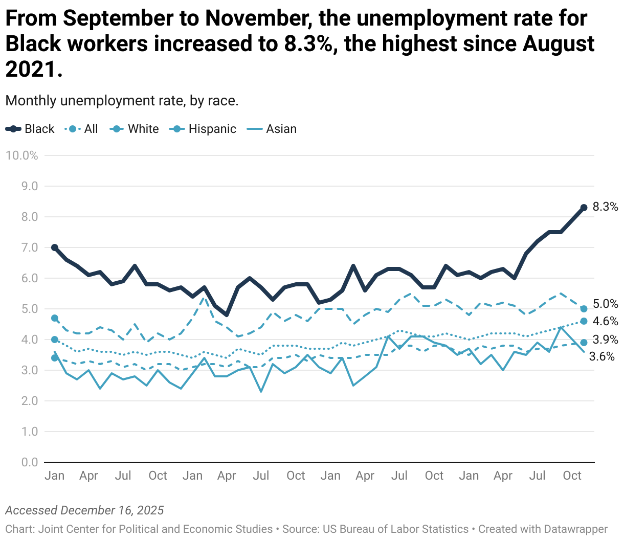 Monthly unemployment rate, by race.