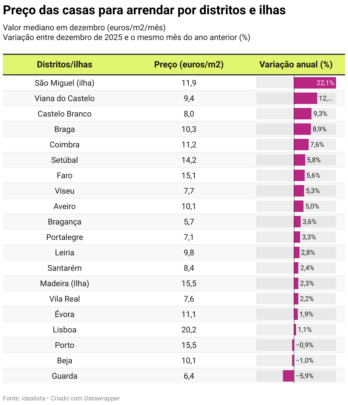 Valor mediano em dezembro (euros/m2/mês) Variação entre dezembro de 2025 e o mesmo mês do ano anterior (%)