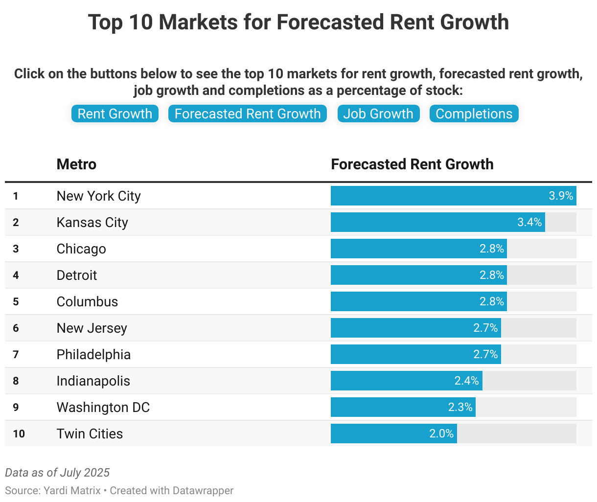 Click on the buttons below to see the top 10 markets for rent growth, forecasted rent growth, job growth and completions as a percentage of stock: