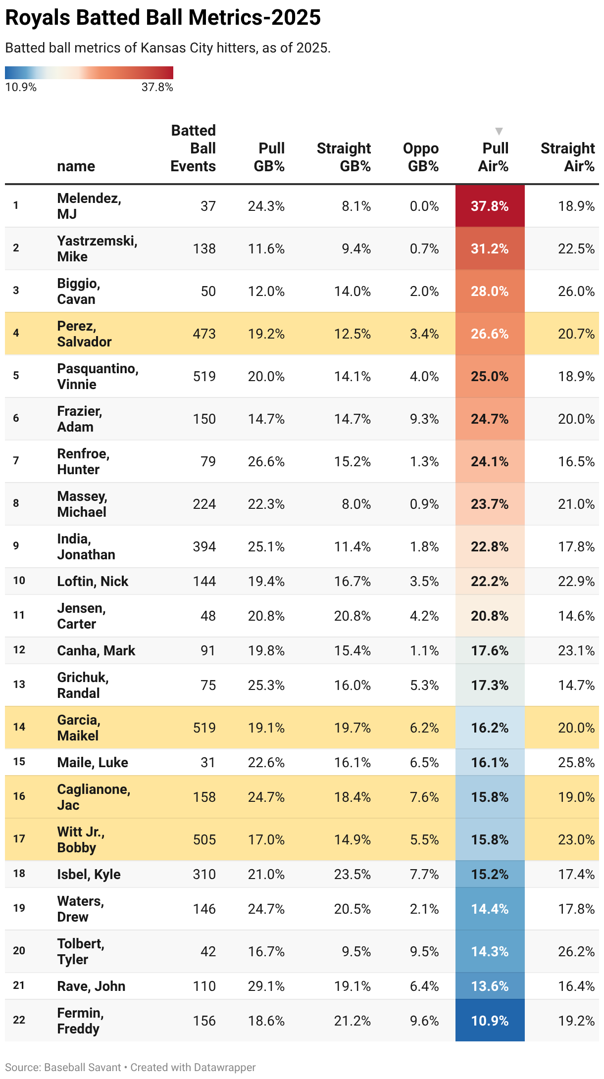 Batted ball metrics of Kansas City hitters, as of 2025.