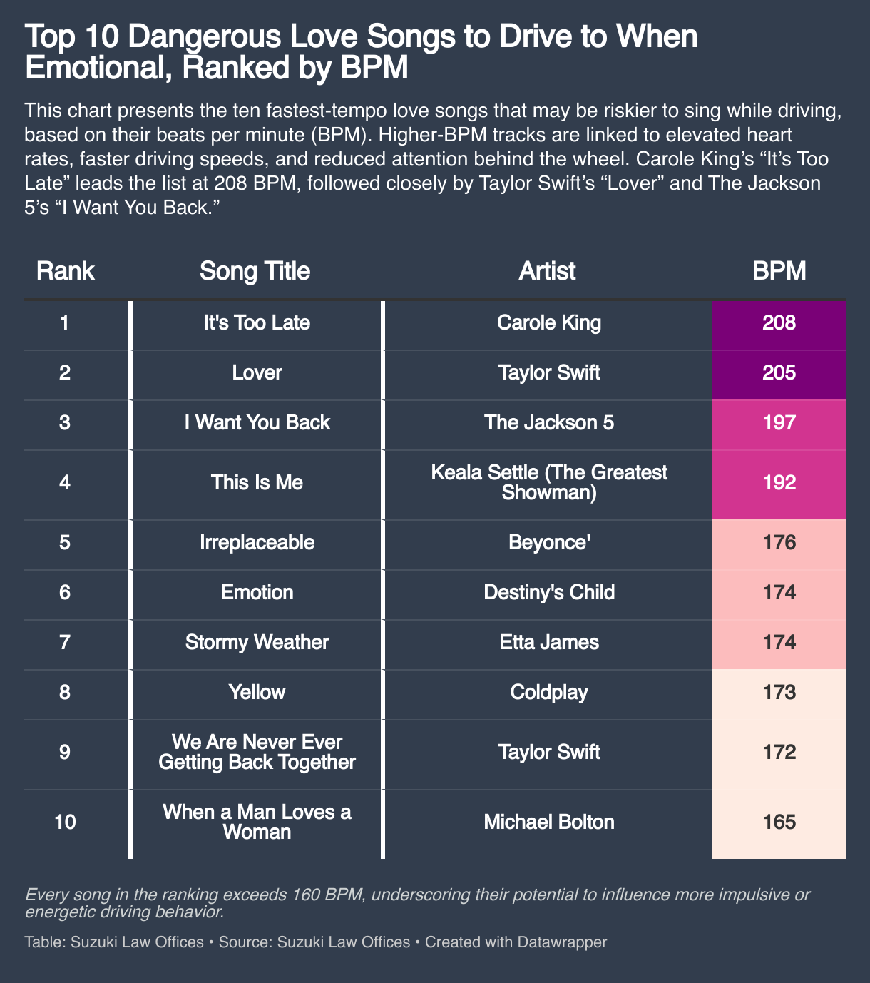 This chart presents the ten fastest-tempo love songs that may be riskier to sing while driving, based on their beats per minute (BPM). Higher-BPM tracks are linked to elevated heart rates, faster driving speeds, and reduced attention behind the wheel. Carole King’s “It’s Too Late” leads the list at 208 BPM, followed closely by Taylor Swift’s “Lover” and The Jackson 5’s “I Want You Back.”