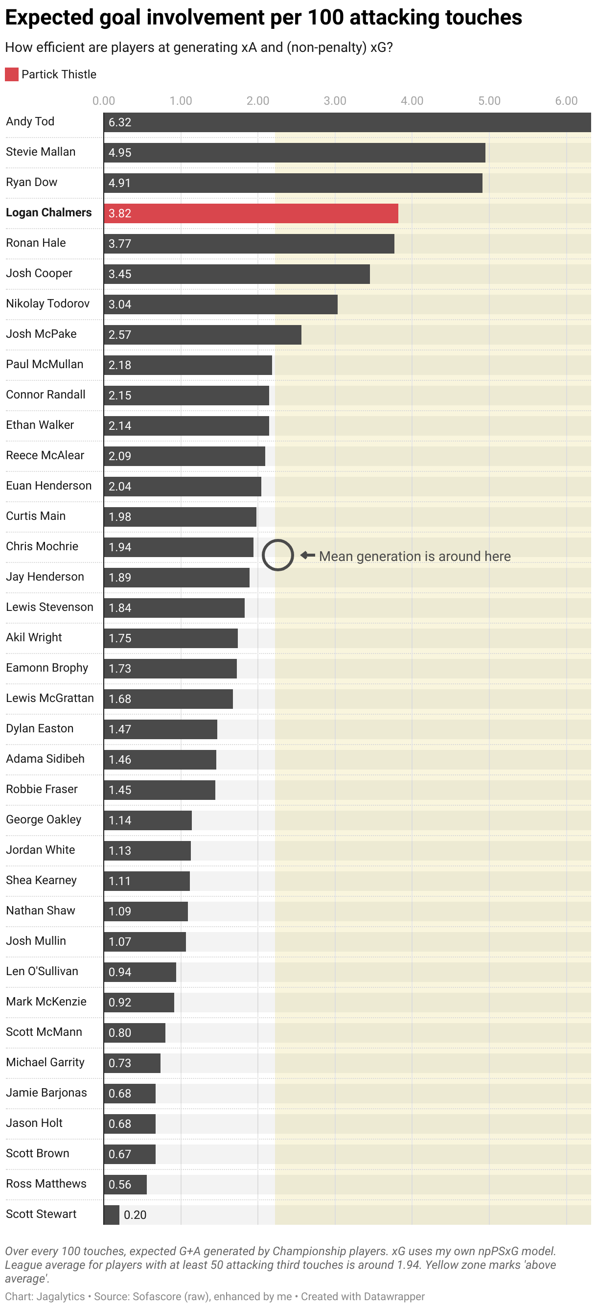 Logan Chalmers generates more expected goal involvements per 100 touches than almost every other player in the league, and at a rate of around 2x the league average for forward players.
