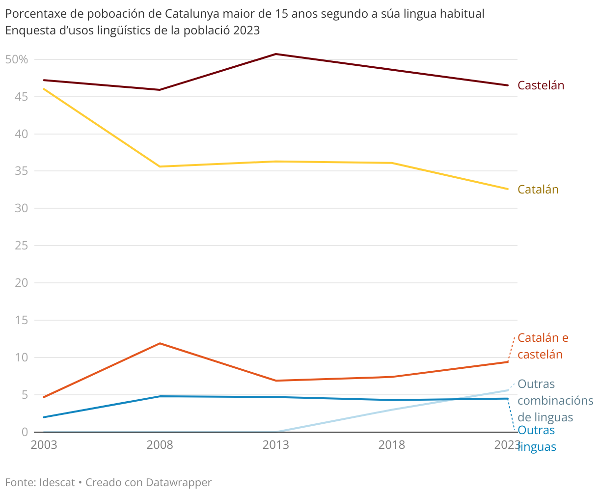 Porcentaxe de poboación de Catalunya maior de 15 anos segundo a súa lingua habitual Enquesta d’usos lingüístics de la població 2023