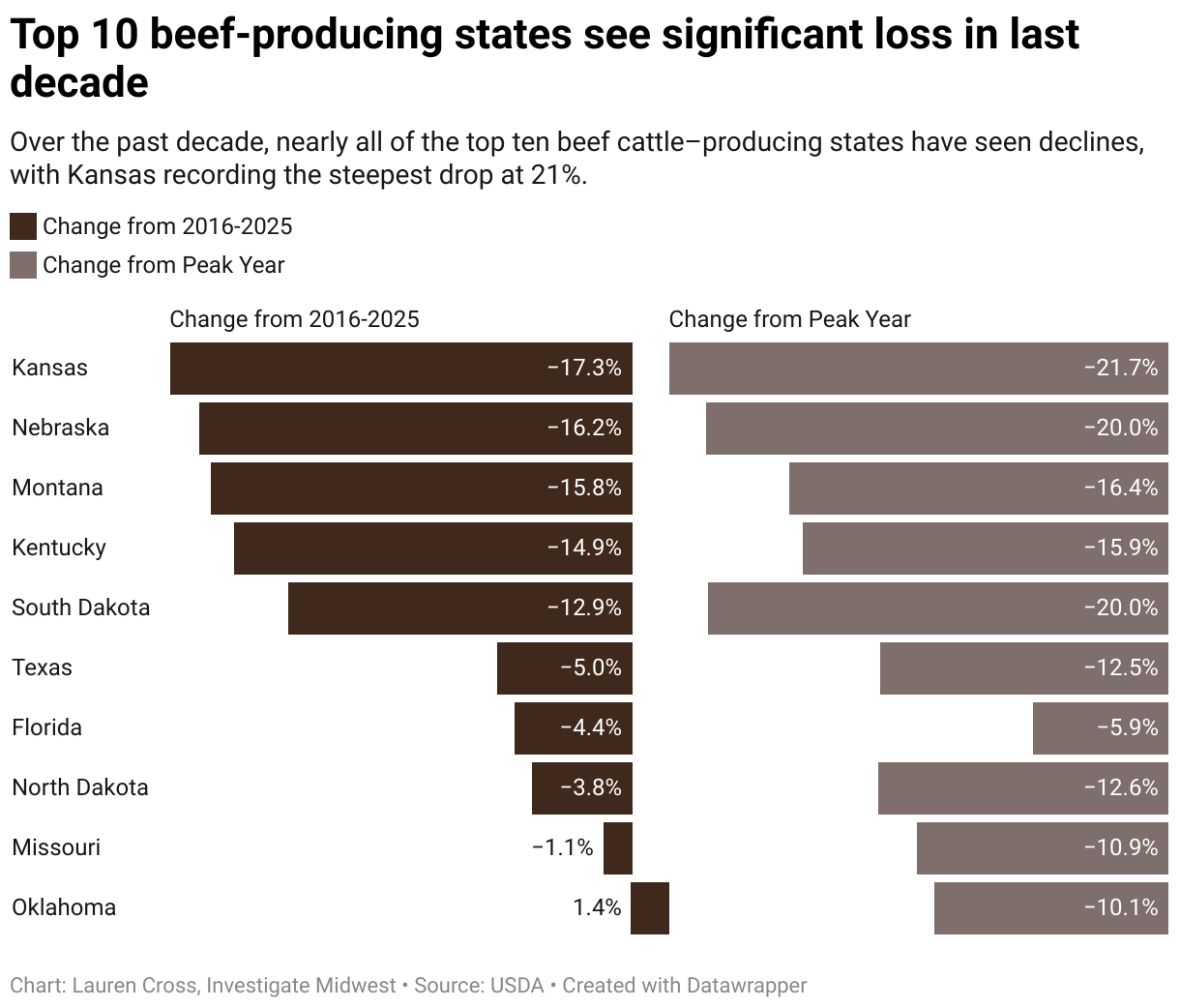 Over the past decade, nearly all of the top ten beef cattle–producing states have seen declines, with Kansas recording the steepest drop at 21%.