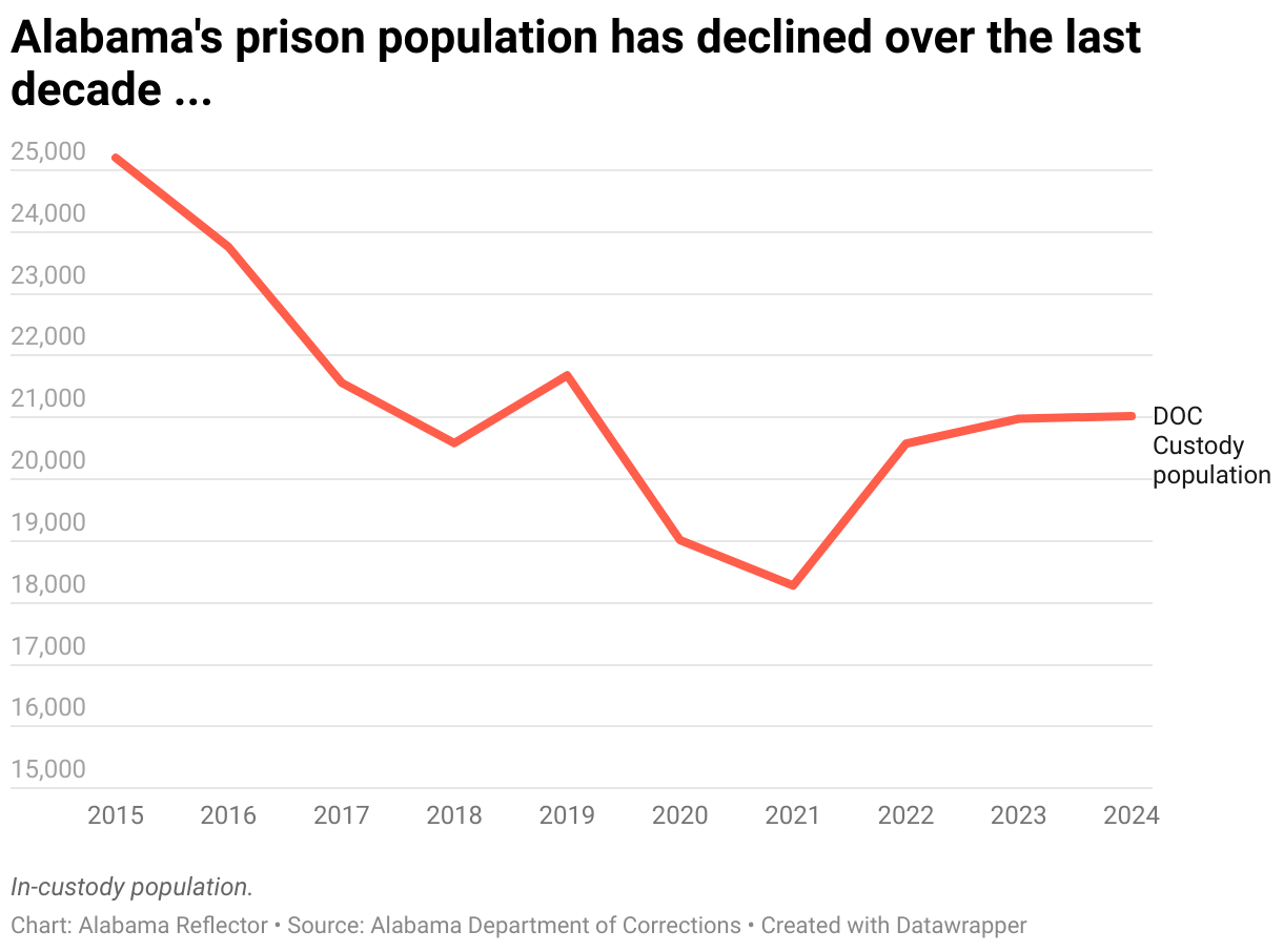 A line graph showing a decline in the in-custody population in the Alabama Department of Corrections.