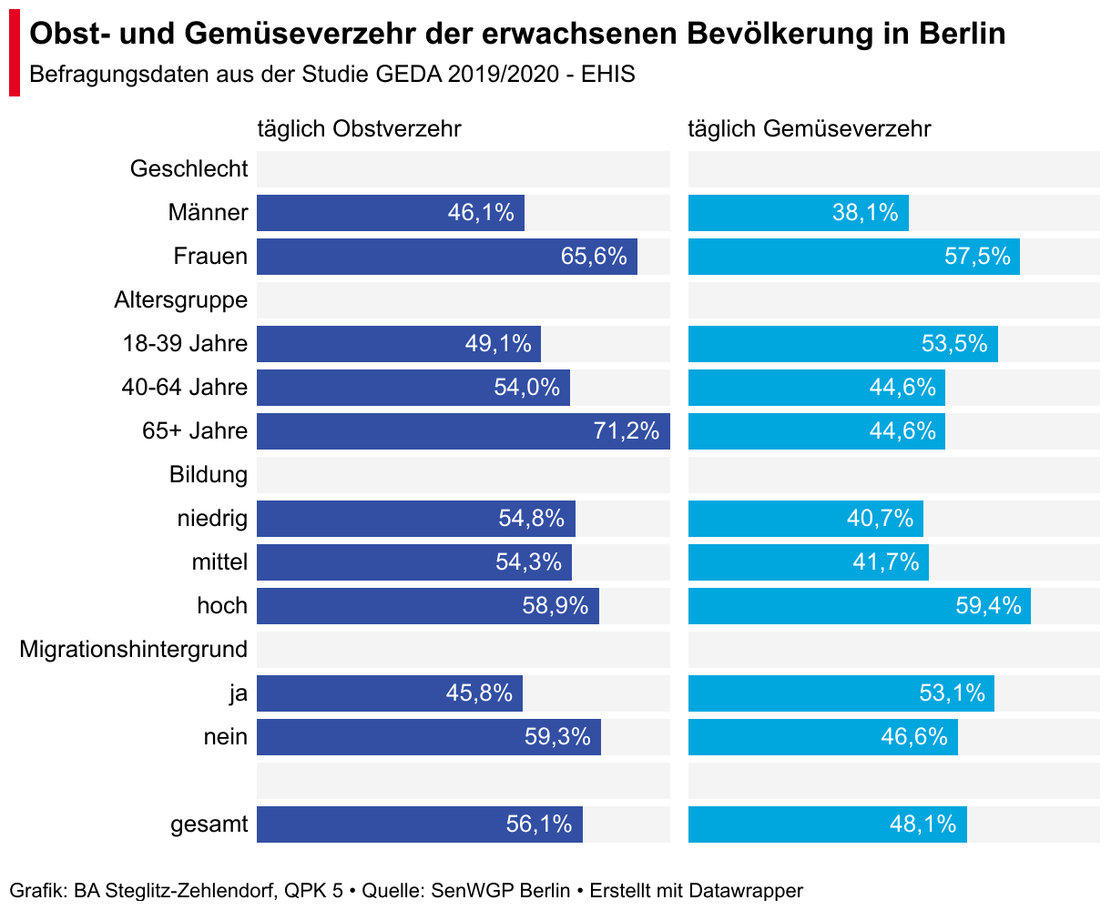 Balkendiagramm mit dem Anteil Erwachsener in Berlin mit täglichem Obstverzehr und mit täglichem Gemüseverzehr, nach Geschlecht, Altersgruppe, Bildung und Migrationshintergrund