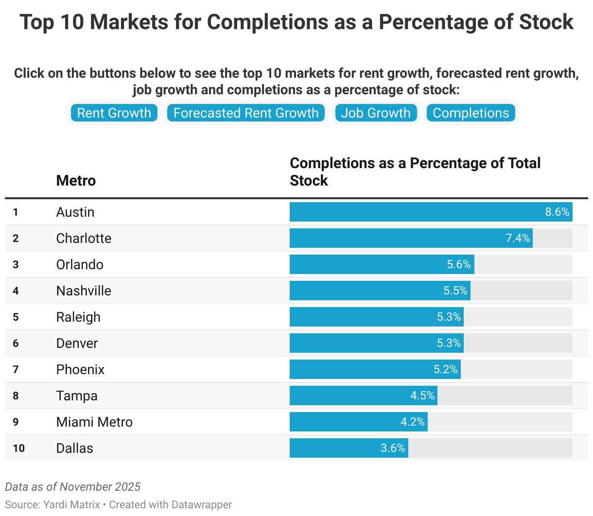 Click on the buttons below to see the top 10 markets for rent growth, forecasted rent growth, job growth and completions as a percentage of stock: