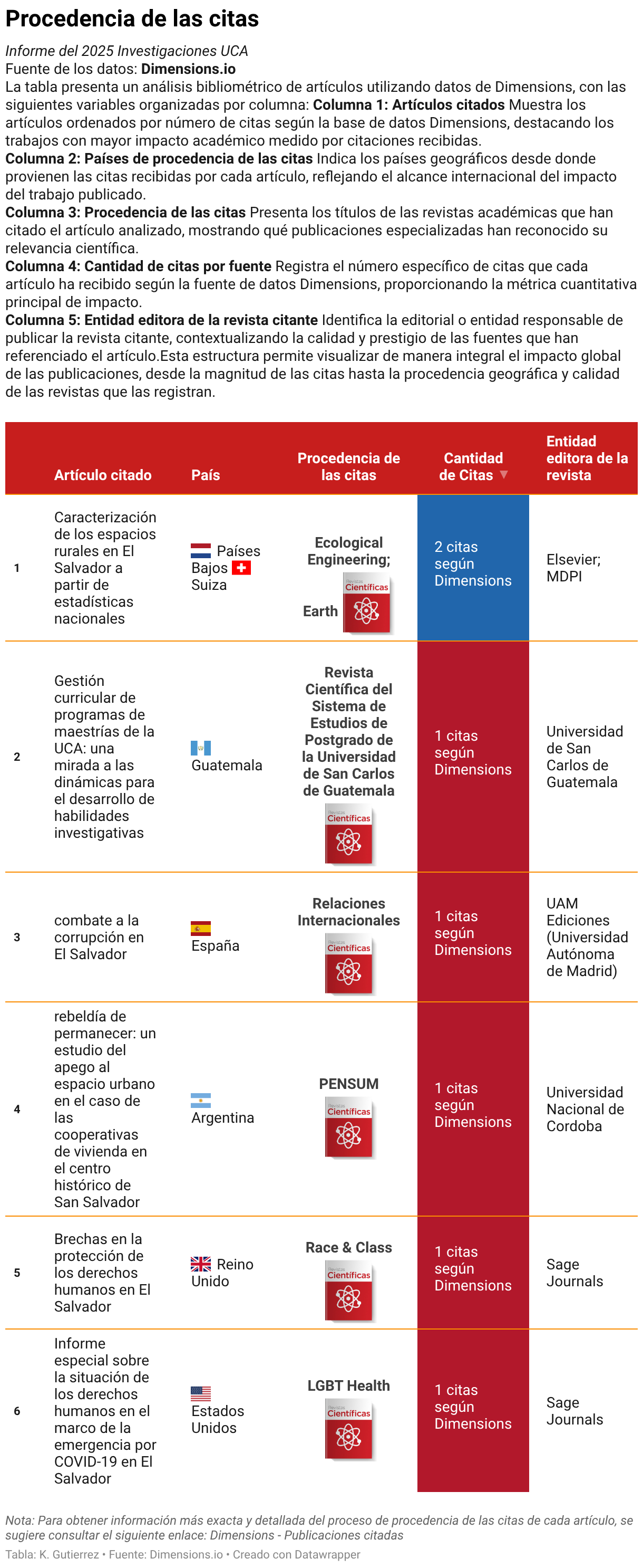 Esta estructura permite visualizar de manera integral el impacto global de las publicaciones, desde la magnitud de las citas hasta la procedencia geográfica y calidad de las revistas que las registran.