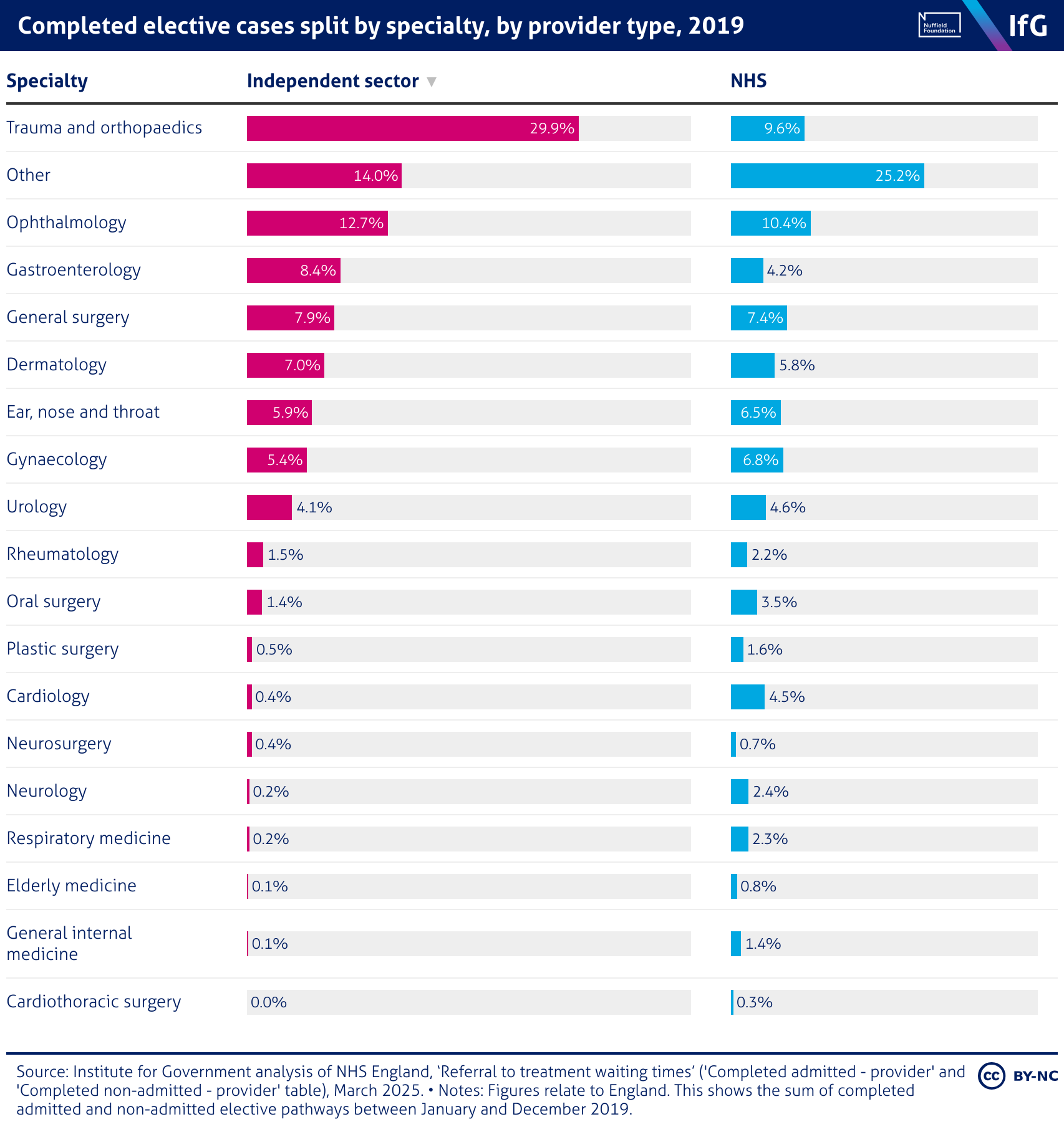 A bar chart from the Institute for Government showing Completed elective cases split by specialty, by provider type, 2019. The independent sector carried out a large share of trauma and orthopaedics (29.9%) and ophthalmology (12.7%) procedures, while the NHS treated a larger variety of cases overall, including 25.2% categorised as “other”.