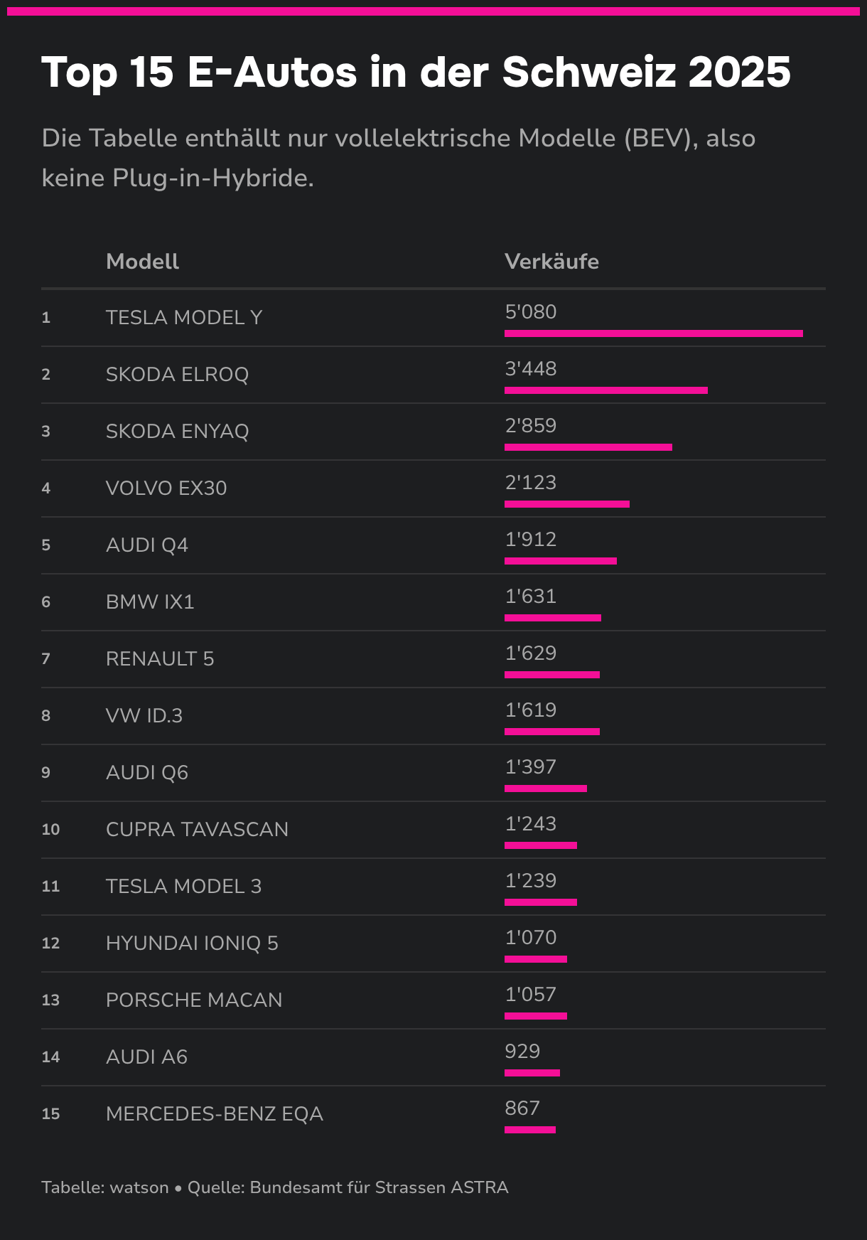 Die Tabelle enthällt nur vollelektrische Modelle (BEV), also keine Plug-in-Hybride.