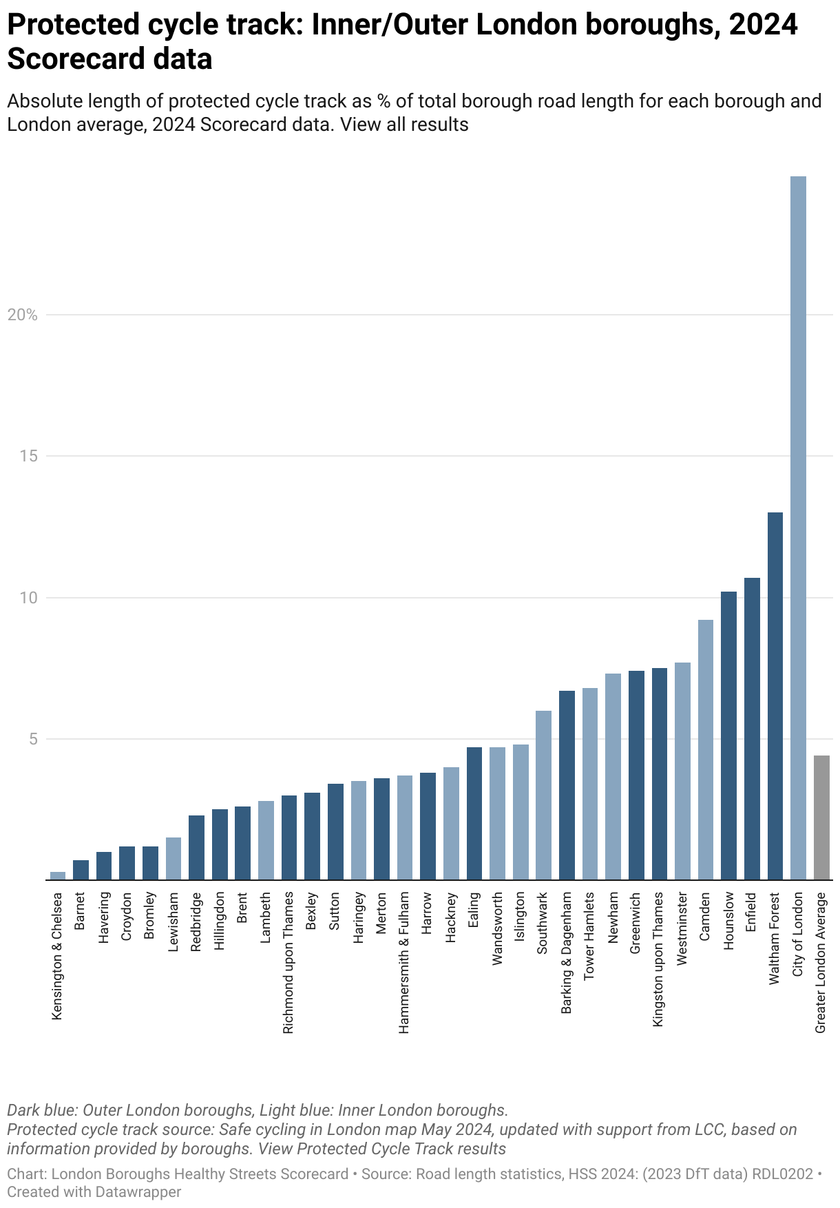 Absolute length of protected cycle track as % of total borough road length for each borough and London average, 2024 Scorecard data. View all results