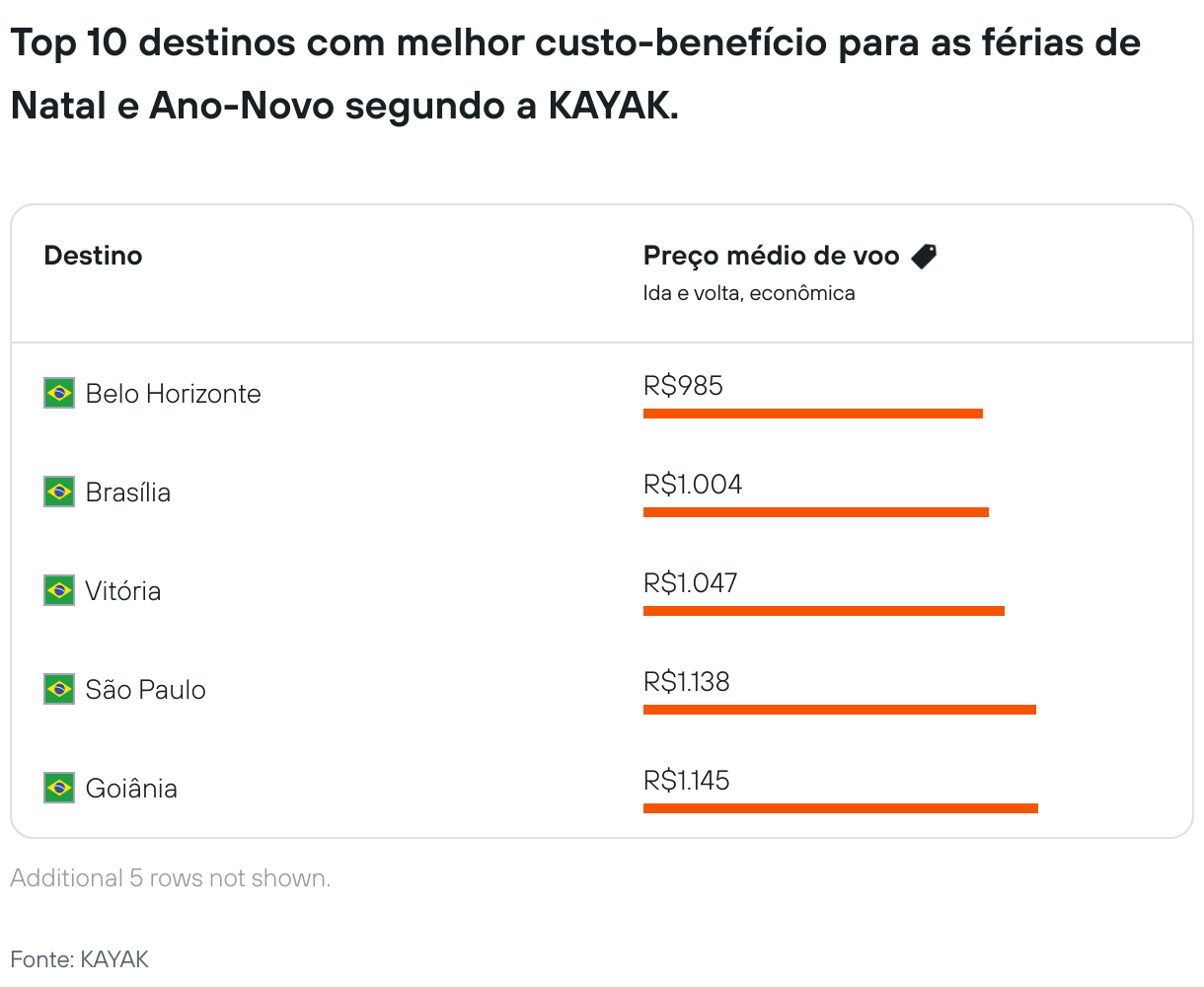 Top 10 destinos com melhor custo-benefício para as férias de Natal e Ano-Novo segundo a KAYAK.