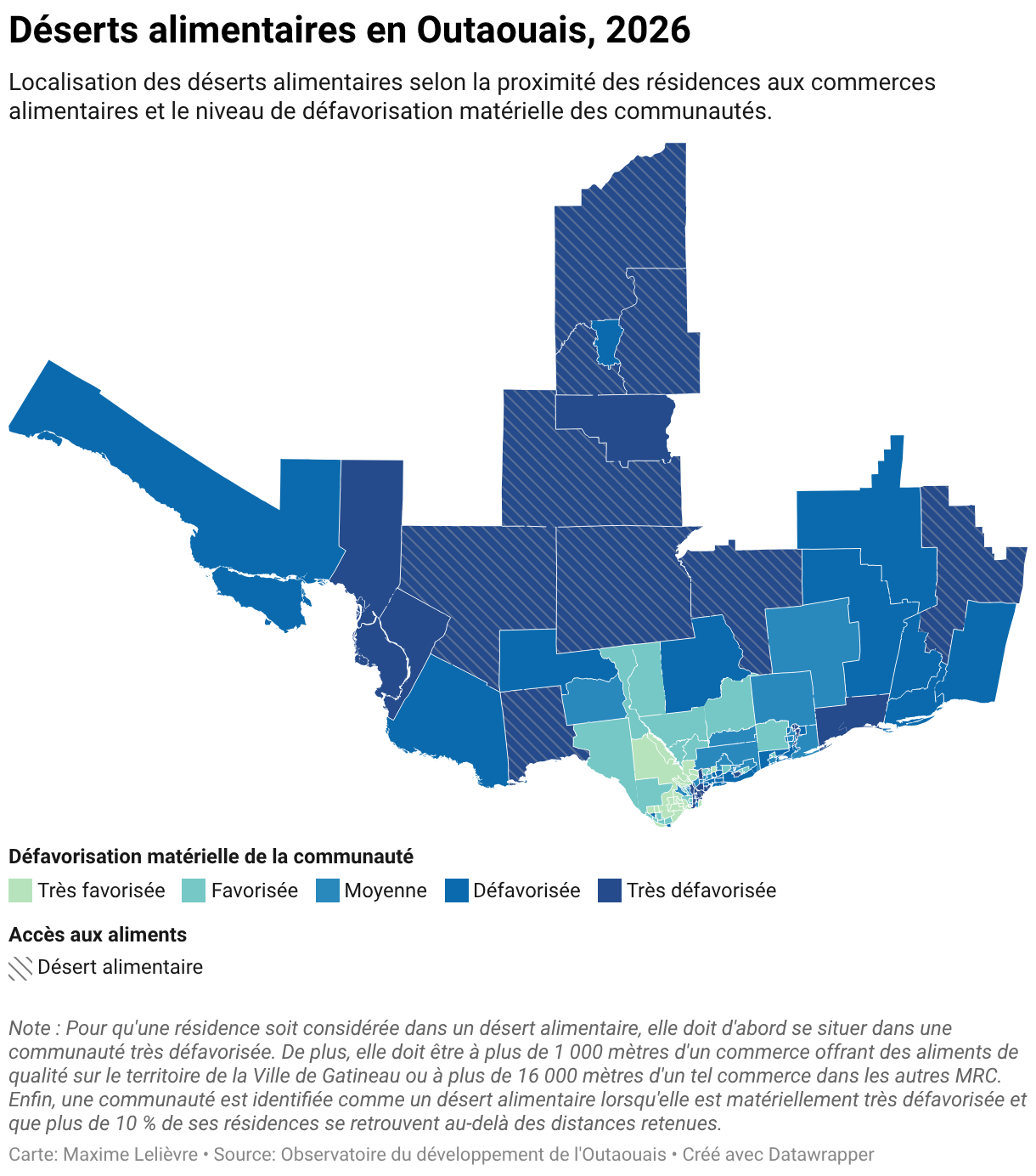 Localisation des déserts alimentaires selon la proximité des résidences aux commerces alimentaires et le niveau de défavorisation matérielle des communautés.