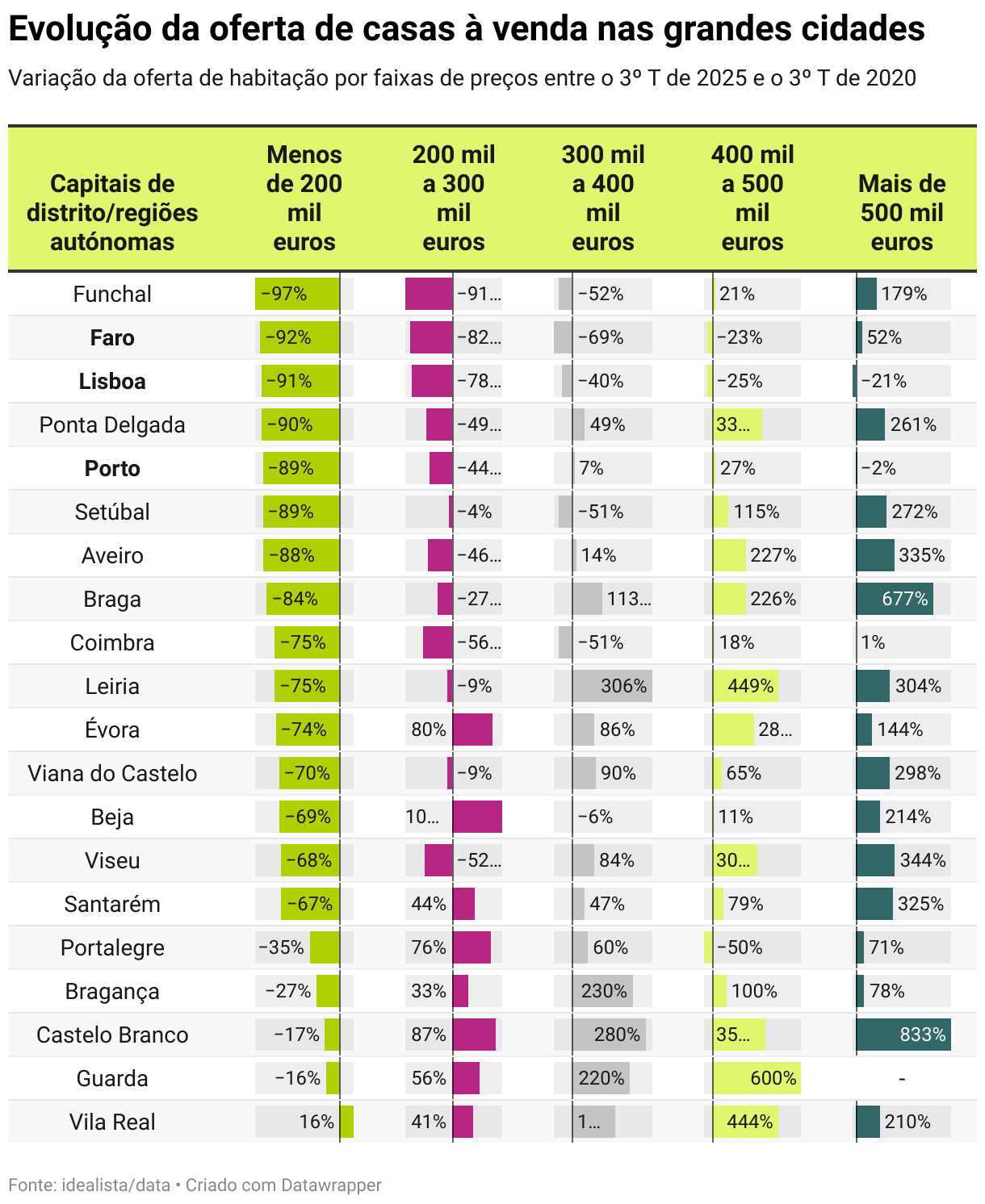 Variação da oferta de habitação por faixas de preços entre o 3º T de 2025 e o 3º T de 2020