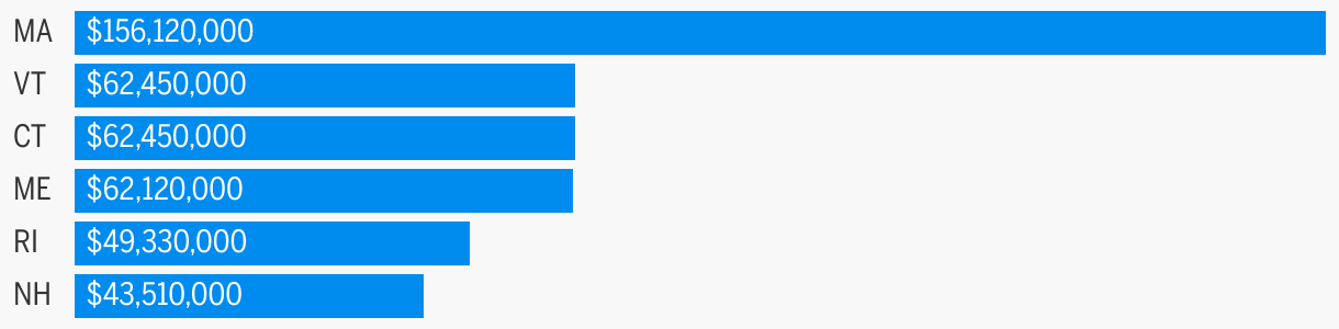 A bar chart showing how much funding each state was awarded to each New England state under a "Solar for All" program.