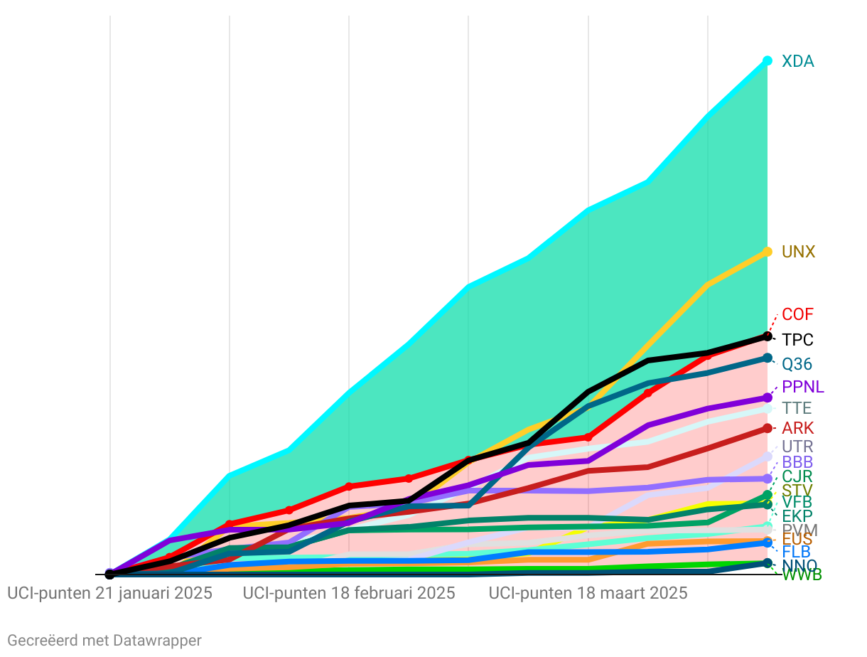 In onderstaande grafiek is het verloop te zien van het aantal gepakte punten door de nummers 17 (aan het begin van het jaar Picnic PostNL) tot en met het laatste ProTeam op de UCI Team Ranking in het seizoen 2025. Links de beginwaarde van ieder team aan het begin van het seizoen 2025, rechts het huidige aantal punten. Op basis van deze ranking, krijgen de eerste twee ProTeams startrecht voor alle WorldTour-wedstrijden in 2026. Dat is inclusief de grote rondes. Picnic PostNL en Cofidis zijn meegenomen, omdat zij zich in de degradatiezone bevinden. Een ploeg die degradeert ziet de UCI meteen als ProTeam. Daarom kunnen we stellen dat de eerste twee ProTeams van deze trendgrafiek de gegarandeerde wildcards krijgen voor 2026, als we Picnic PostNL en Cofidis (voorlopig) buiten beschouwing laten. Overigens verzekert het derde ProTeam op deze grafiek zich aan het einde van het jaar voor een gegarandeerde wildcard voor alle WorldTour-eendagsklassiekers. Bovendien kun je alleen voor wildcards in aanmerking komen als je aan het einde van het jaar 2025 in de top-30 van de UCI Team Ranking staat.