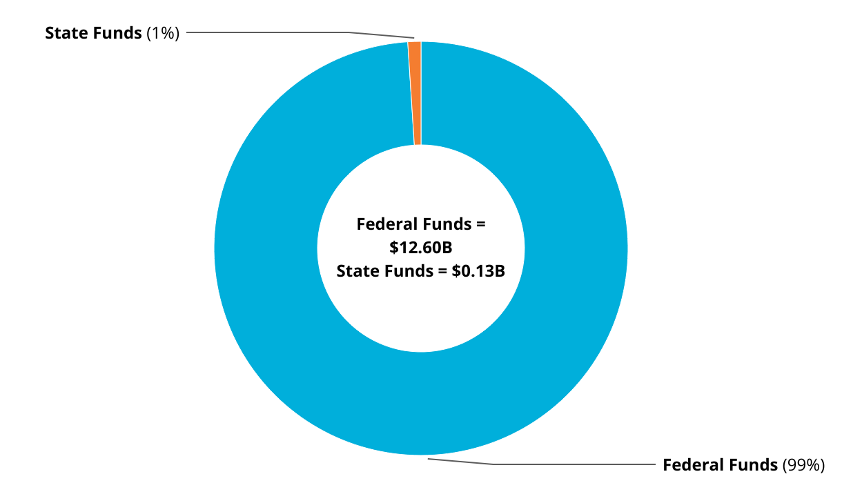 The donut chart represents what proportion of food assistance programs in California are funded by federal and state dollars. In blue the chart shows $12.6 billion (99%) are federally funded and $0.13 billion (1%) are state funded