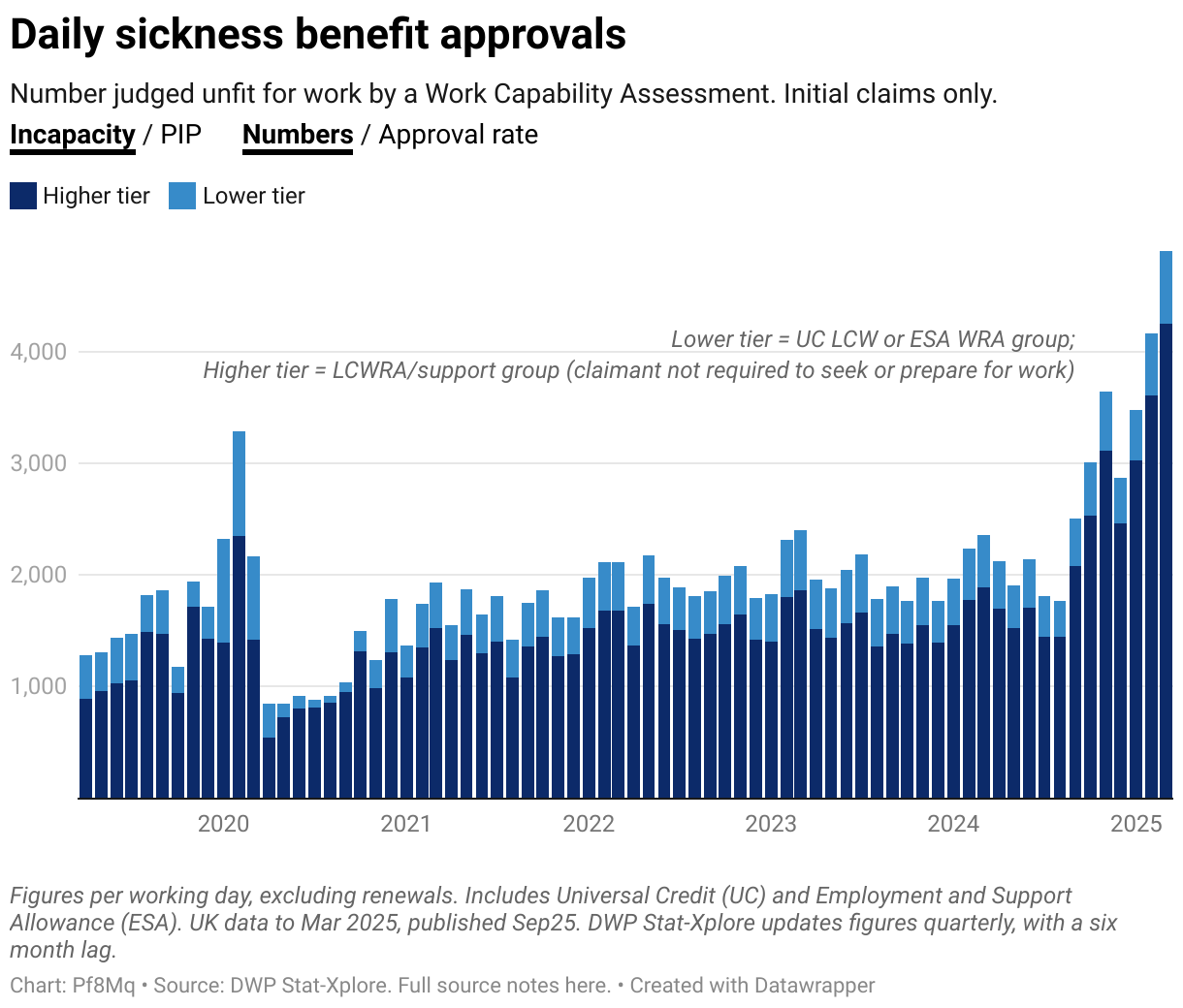 Number judged unfit for work by a Work Capability Assessment. Initial claims only. Incapacity / PIP Numbers / Approval rate