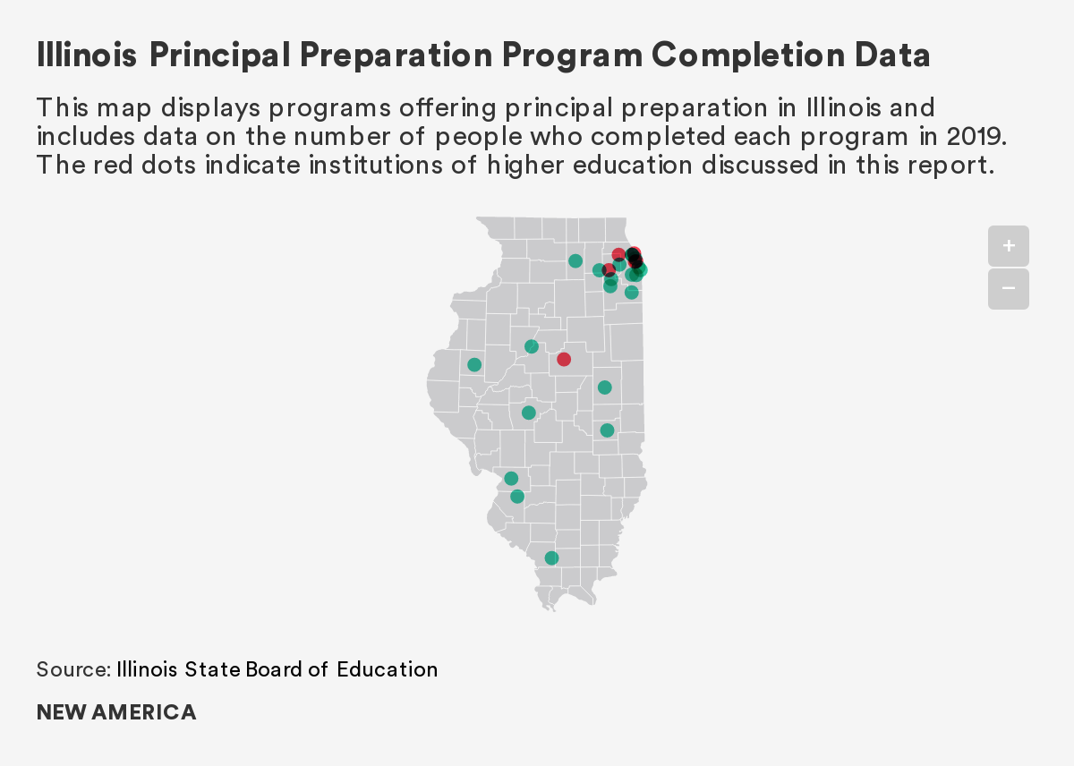 This map displays programs offering principal preparation in Illinois and includes data on the number of people who completed each program in 2019. The red dots indicate institutions of higher education discussed in this report.