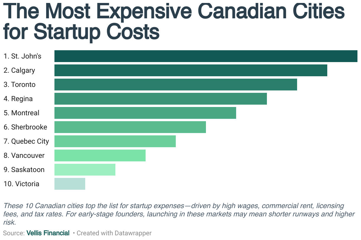 A horizontal bar chart ranking the 10 most expensive Canadian cities for startup costs in 2025. St. John’s ranks highest, followed by Calgary and Toronto. Costs are based on wages, rent, setup fees, and taxes.