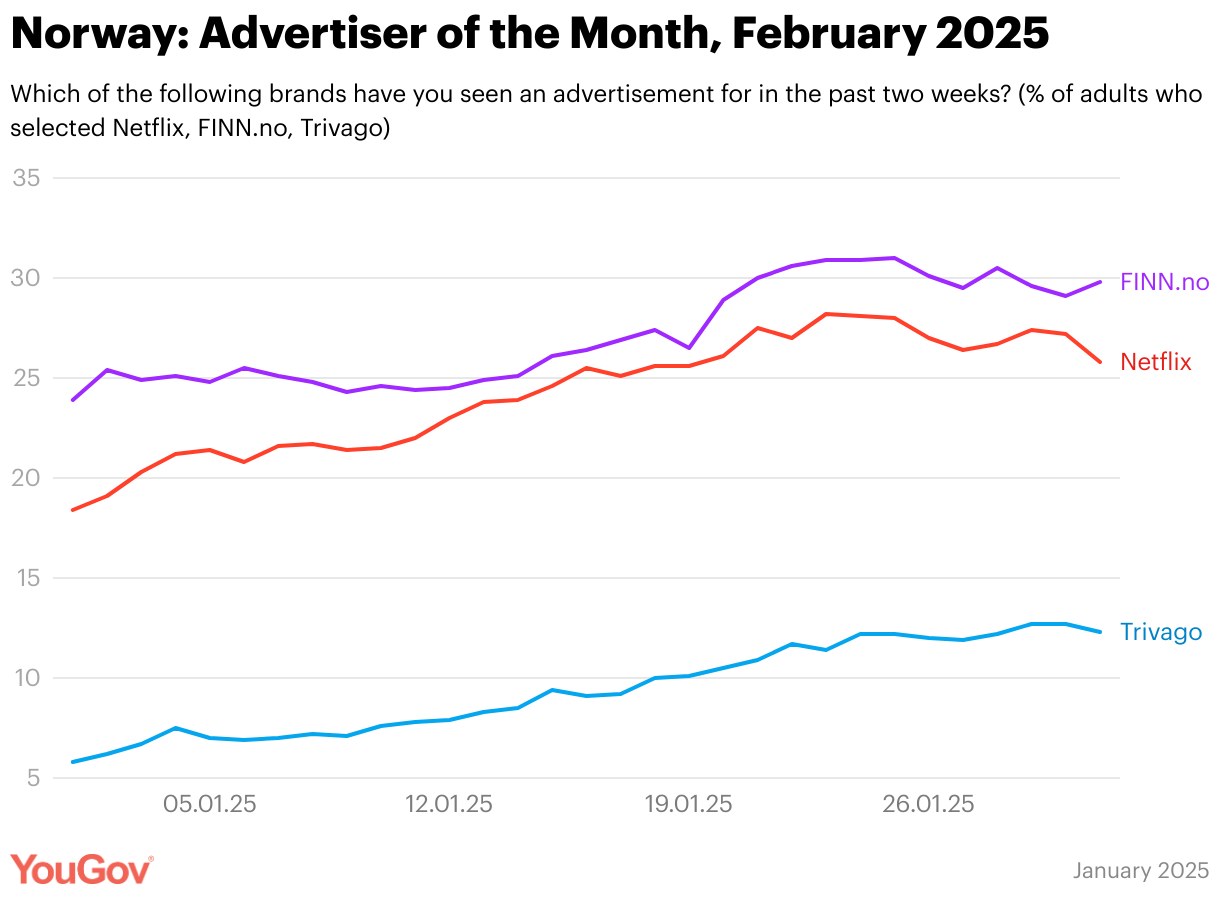Which of the following brands have you seen an advertisement for in the past two weeks? (% of adults who selected Netflix, FINN.no, Trivago)