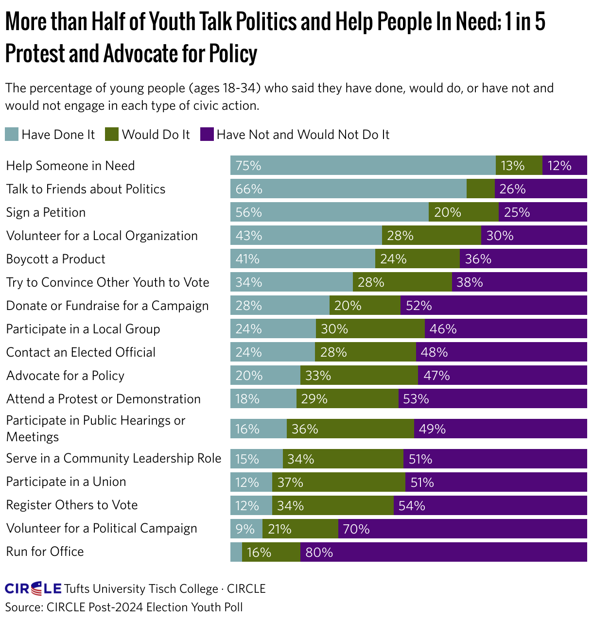 The percentage of young people (ages 18-34) who said they have done, would do, or have not and would not engage in each type of civic action.