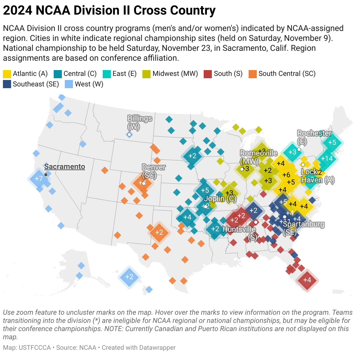NCAA Division II cross country programs (men's and/or women's) indicated by NCAA-assigned region. Cities in white indicate regional championship sites (held on Saturday, November 9). National championship to be held Saturday, November 23, in Sacramento, Calif. Region assignments are based on conference affiliation.